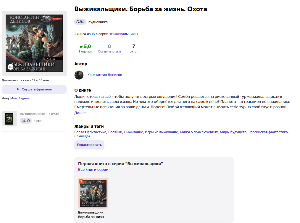 Автор: Константин ДенисовПервый том серии, вслед за бумагой, вышел в аудиоверсии. Но, поскольку этим занимается издательство АСТ, они сами выбирают площадки для размещения. К сожалению, АТ в их число не входит. По правилам сайта, я не могу оставлять ссылки на сторонний ресурс. Когда на АТ не был реализован функционал аудиокниг, тогда было можно. Теперь увы! Я более подробно всё изложил в посте в ВК. Там и ссылка есть, так что, если кто хочет перейти на аудиокнигу, придётся это сделать через "прокладку". Как-то так. Вот ссылка на пост в ВК: