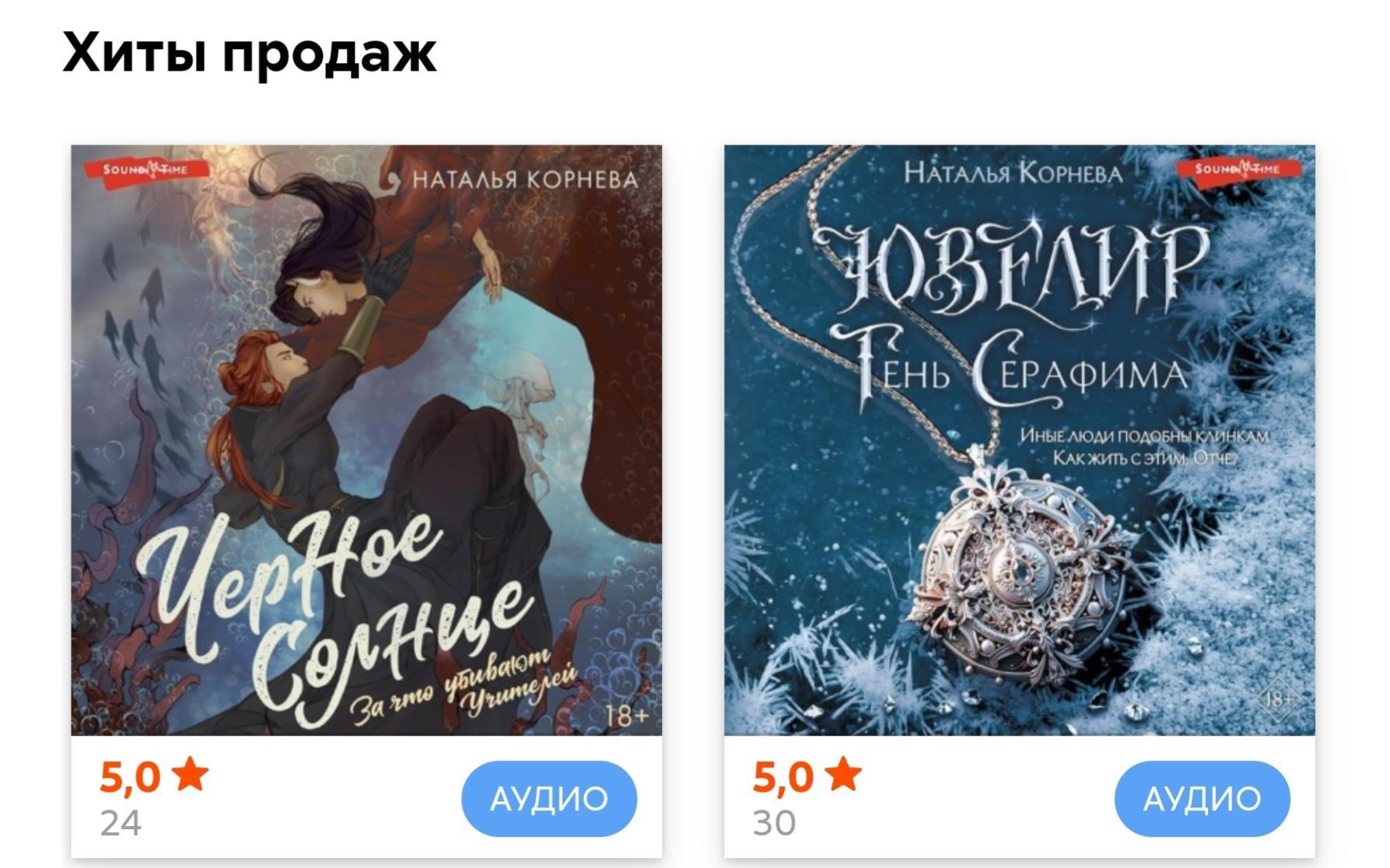- «Чёрное Солнце. За что убивают Учителей» — 1-й том цикла «Чёрное Солнце». Издательство АСТ, чтец — Екатерина Радостева, декабрь 2023
