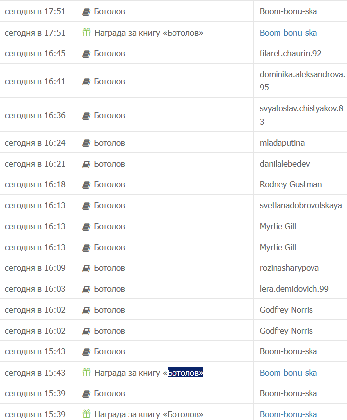 Все эти «покупатели» — мертвые души, боты. Некоторые «имена» используются даже по нескольку раз. После покупки боты самоликвидируются в течении часа-двух. Я успел пройтись по ссылкам и посмотреть, кому еще боты выдавали награды — там засветились книжки с минимальной ценой и максимальной скидкой. Вот описание этой ситуации от еще одного автора, пережившего нашествие ботов.