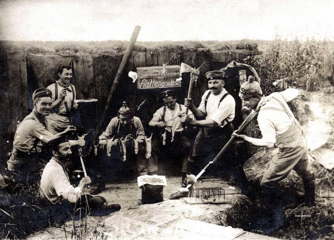 "Сегодня большой пир из крысиного гуляша". Немецкие артиллеристы, готовящие крыс на ужин.