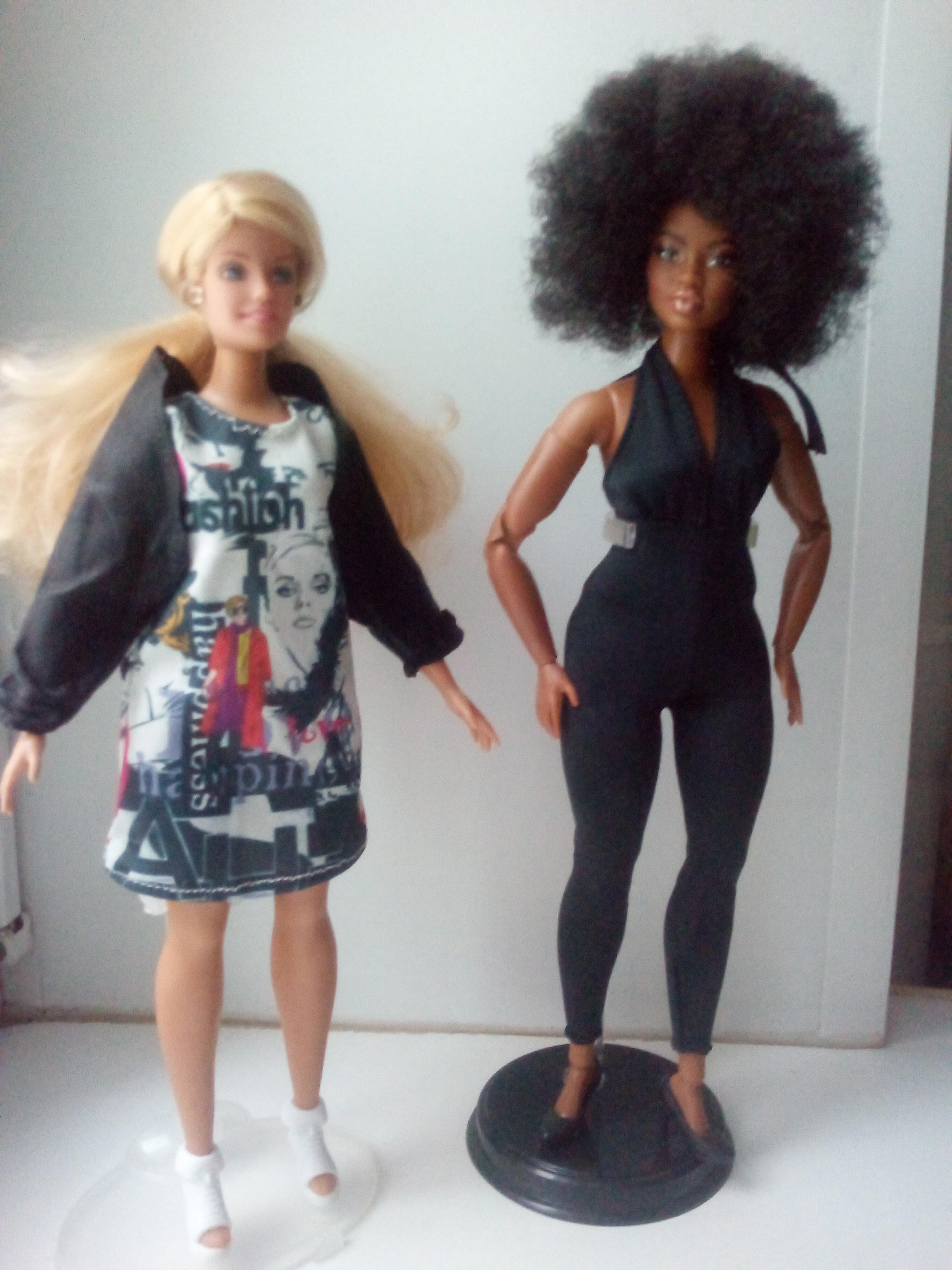 Рейни это Barbie Looks, потрясшая меня невероятной красотой лица и тела. Прикид на ней родной, потому что я пока опасаюсь испортить её фактуру своей дешёвой поделкой. Только серебряные сапожки я заменила ей на чёрные шпильки. Вижу её в образе джазовой певицы. С Шайни вышло ещё веселее, у меня была голова. И под эту голову я мучительно выбирала тело. Остановилась на крупненькой такой особе по приемлемой цене, но доставка была дороже, чем сама тушка. Кукольник я неопытный, и очень боялась, что цвет не совпадёт (если я правильно понимаю, это цвет «калифорниан»), шейный разъем не подойдет и так далее. Цвет совпал идеально, а вот голову я насаживала часа полтора, с кипятком, кухонными ножницами и такой-то матерью. Платье и ботинки покупные, куртку я собрала в этом месяце за 10 минут из двух больших пальцев от кожаной перчатки. Шайни у меня рокерша. Сзади у Шайни шнуровка на ленточке.