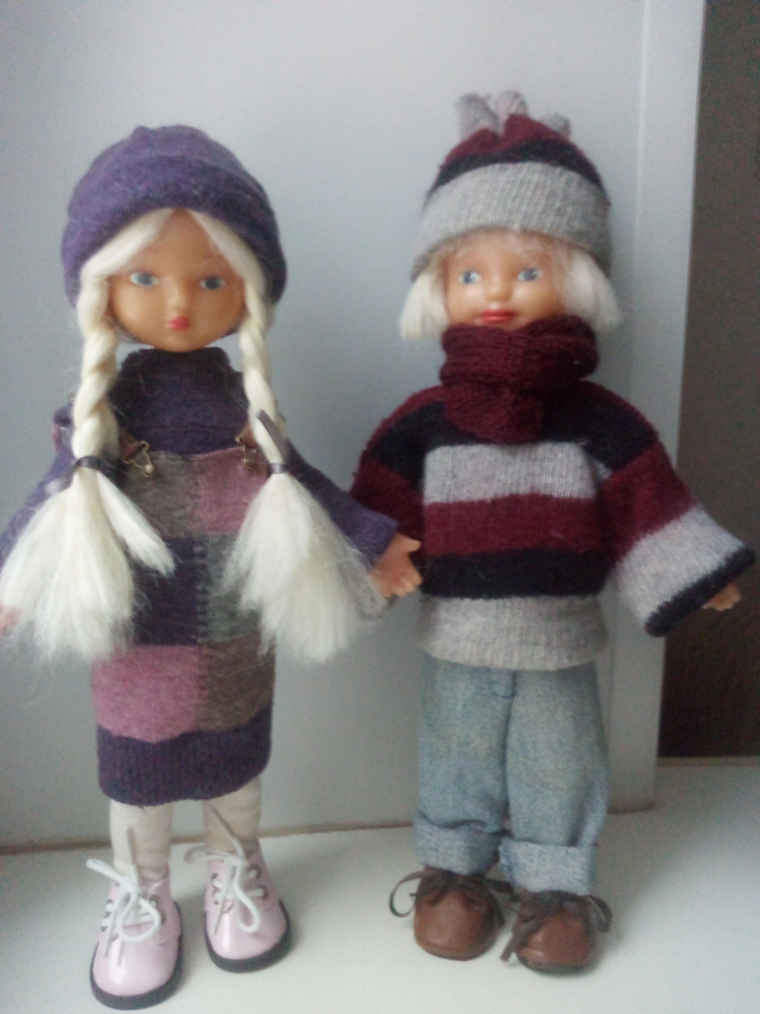 Возможно, я их уже постила, но в этом месяце довела костюмчики до ума, сделала застежки на пуговицы и кнопки, посадила сарафан на лямочки с приличными кукольными застёжками — придают совсем другой вид, это вам не на булавку в невидном месте. На Кайсе покупные ботинки с алиэкспресса, Тойво полностью одет моими силами (это первые склеенные мною ботинки!). Это зимний вариант их образа, летом там всё другое.