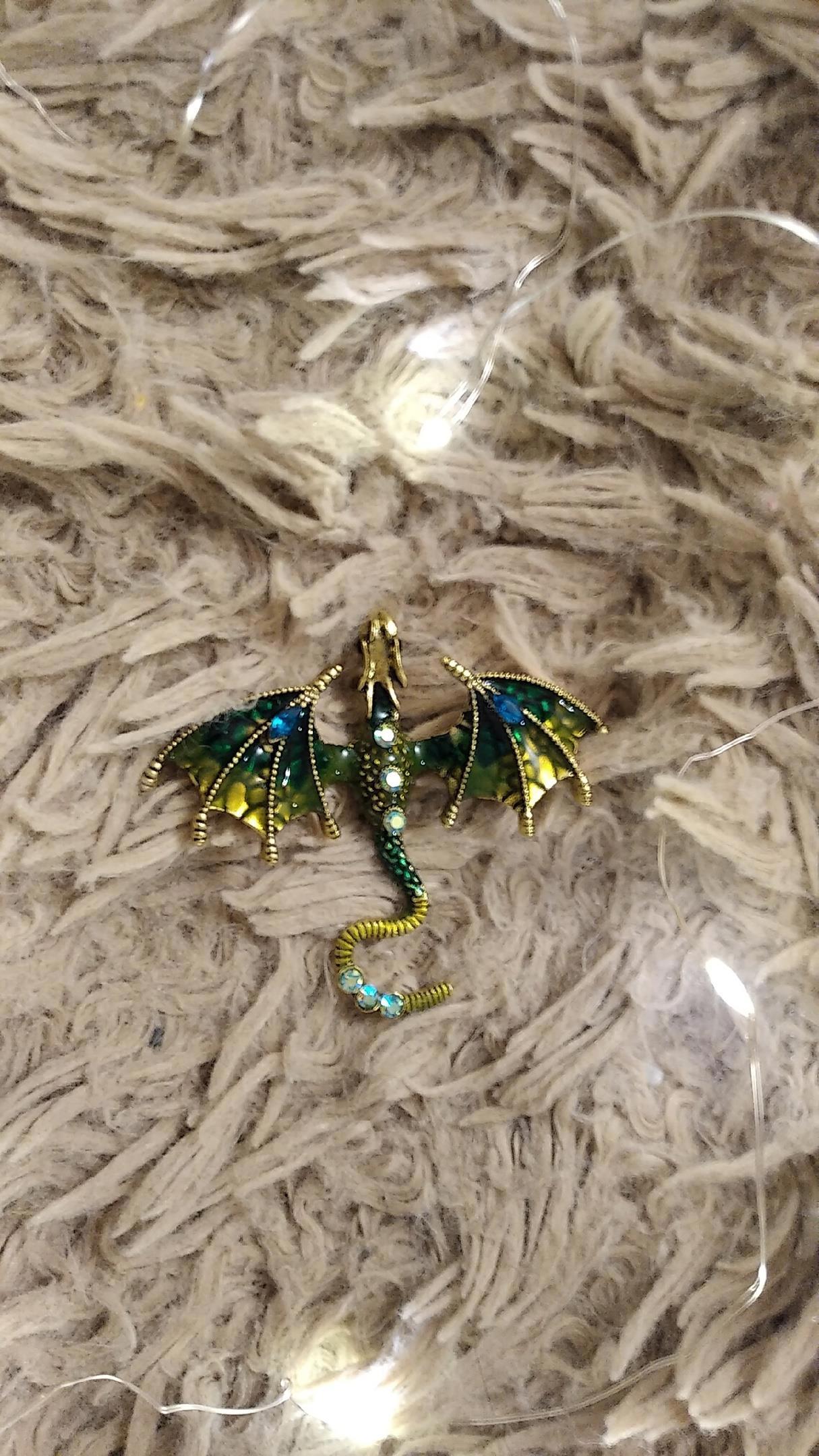 Она такая чудесная! Переливается на свету, но при этом отчетливо видно, что это зеленый дракон. А жемчужный хвостик мог бы даже свидетельствовать о том, что перед нами мог быть даже воплощенный в виде броши сын Гретты и Виланда, во как!)