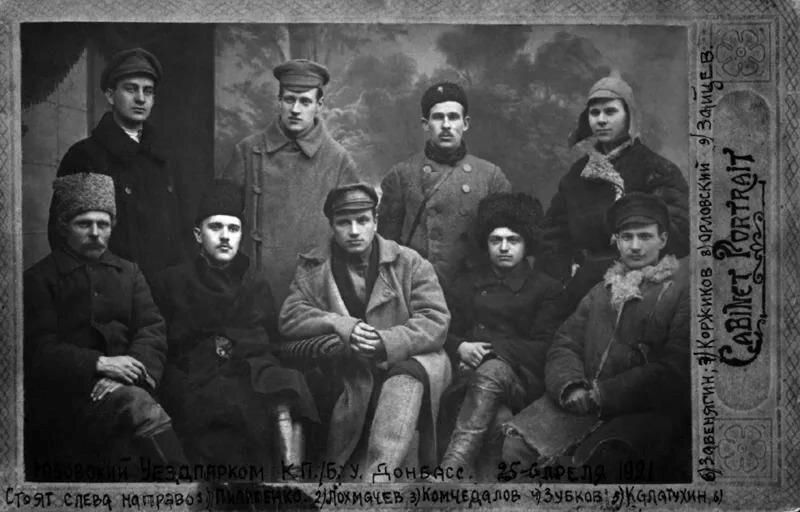 Вот фотография тогдашнего руководства Юзовки – Коржиков в шинели в центре, слева от него, в папахе – Завенягин.