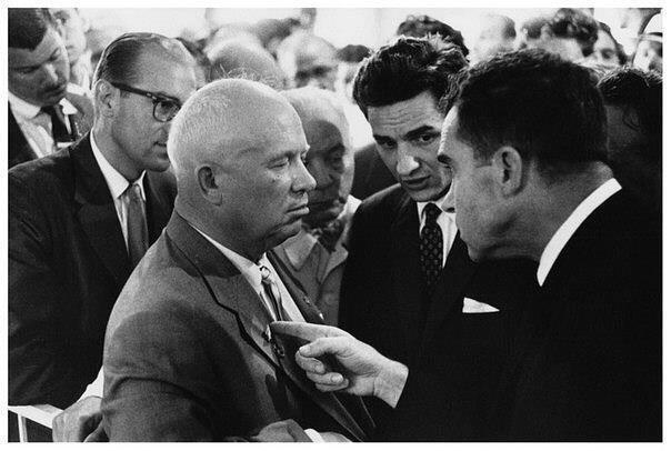 Помните, как министр иностранных дел Лавров ругался матом на арабских журналистов? Оказывается, не он первый. В июле 1959 года в Москву прилетел вице–президент США Ричард Никсон. Он вместе с Хрущевым открывал Американскую национальную выставку в парке "Сокольники". Прогуливаясь по выставке в компании Хрущева, Никсон остановился возле модели кухни пригородного американского дома, там между политиками вспыхнул длительный спор. По словам фотографа Эллиотта Эрвитта, снявшего знаменитую фотографию, где Никсон тычет пальцем в Хрущева (выше), в дебатах проскочили две фразы, которые не вошли ни в одну из публикаций. Никсон сказал: "Мы богатые, а вы бедные. Мы едим мясо, а вы едите капусту!". Хрущев ответил просто: "Да пошел ты на ...!".