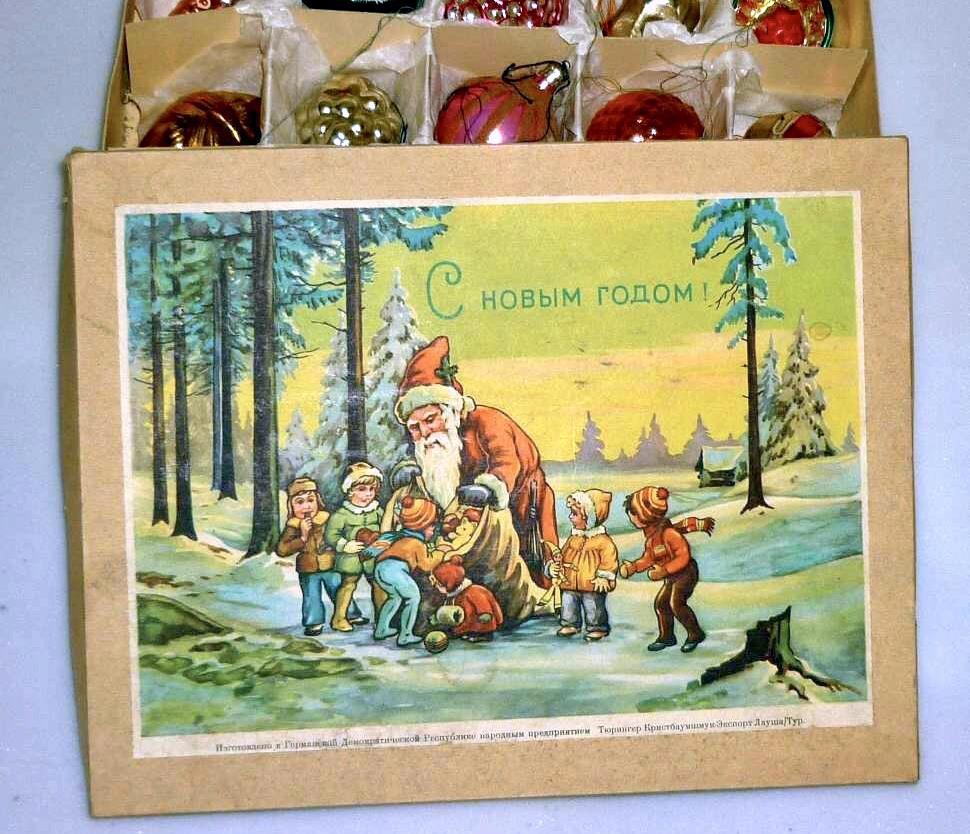 Сейчас правда уже можно встретить и Деда Мороза на стенах и дверях магазинов, на стендах, на пакетах. Но почему-то чаще встречаешь Санта Клауса и его оленей. И не Пэр-Ноэля (Франция), не Юлетомте (Дания), не Крискинда (Лихтенштейн), не Юлебукка (Норвегия), не Йоулупукки (Финляндия), а именно Санту Клауса — лицо Кока Колы. И ещё недавно их было так много, что плакат с Дедом Морозом для детского сада было почти не найти, одни Санты. Лично меня очень раздражает, этот кокакольный Санта. А песенка "Джингл беллс" просто бесит уже! И это не потому что они плохие, нет! Просто этой чужой атрибутики Нового года слишком много! Слиш-ком! Я абсолютно ничего не имею против Санта Клауса! Во времена моего детства в семье был огромный набор немецких ёлочных игрушек, в коробке с такой вот крышкой.