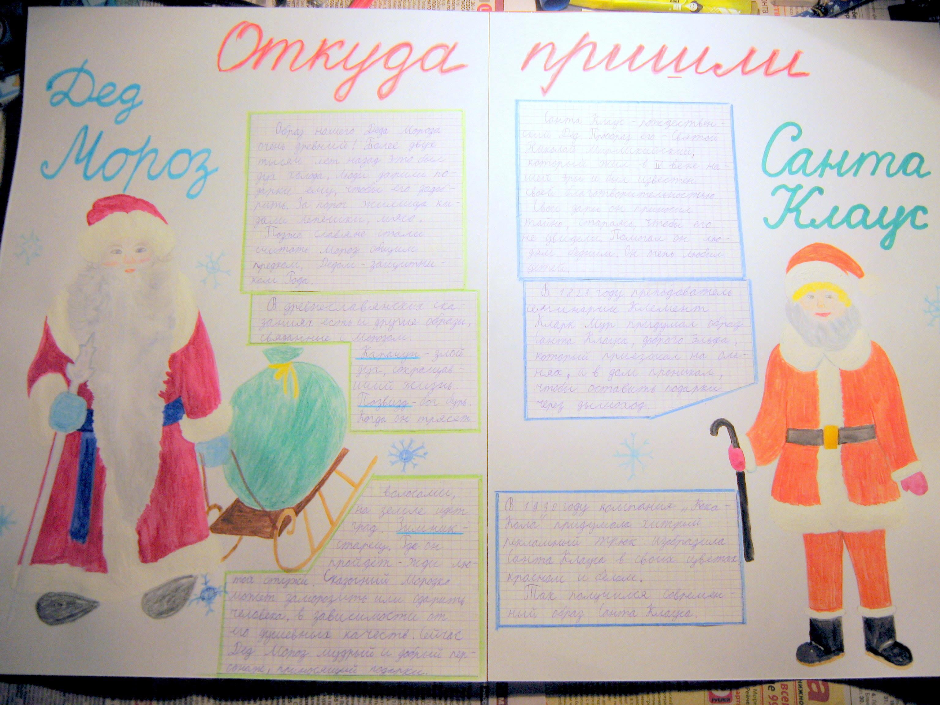 Несколько лет назад, когда младший сын был в четвёртом классе, мы с ним делали что-то вроде стенгазеты к Новому году как раз про Деда Мороза и Санта Клауса.