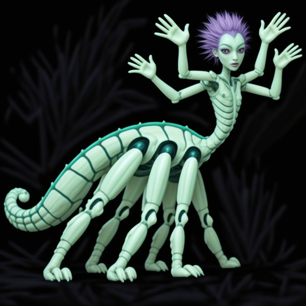 Тут, конечно, не все супер-точно, пропорции немного не те и некоторые детали другие, но такой рисунок самостоятельно я бы за несколько минут не выдала. Главное, что Krea Canva правильно изобразила саму структуру инопланетянина: шесть ног, четыре руки, хвост-брюшко и гуманоидная голова. Пока я большего от нее и не требовала, потом попытаюсь изобразить все более точно. А вот генерация другой героини: