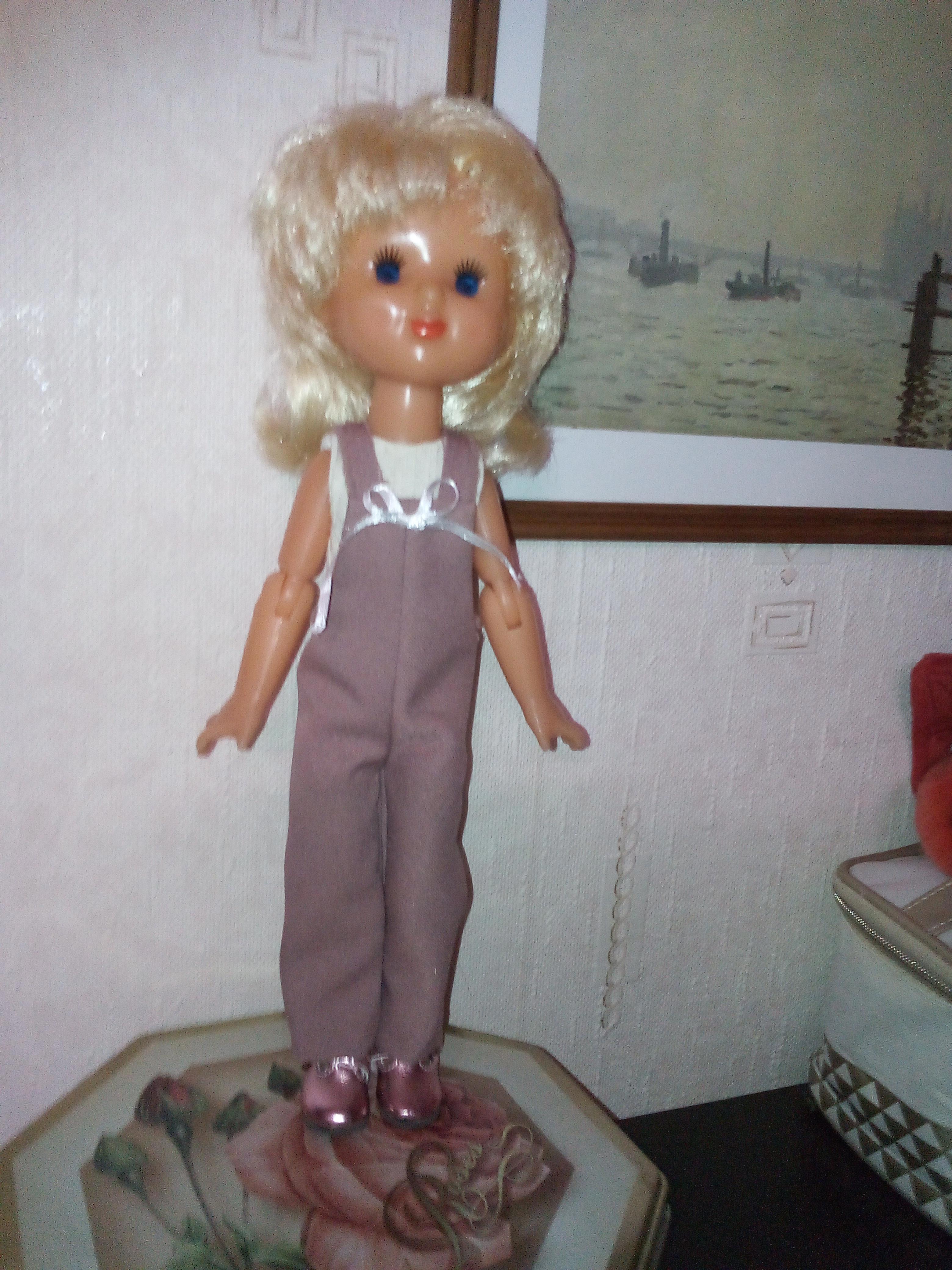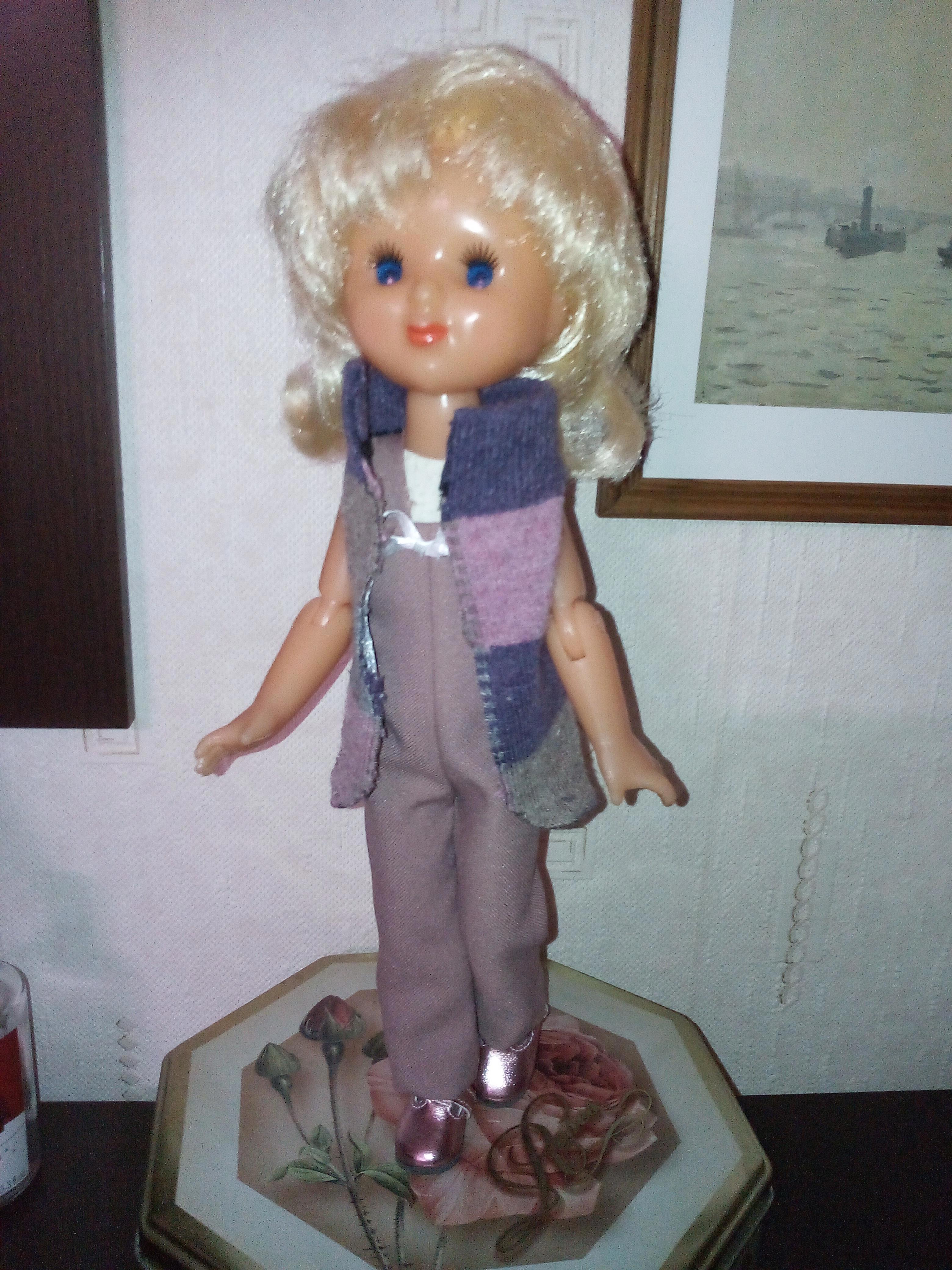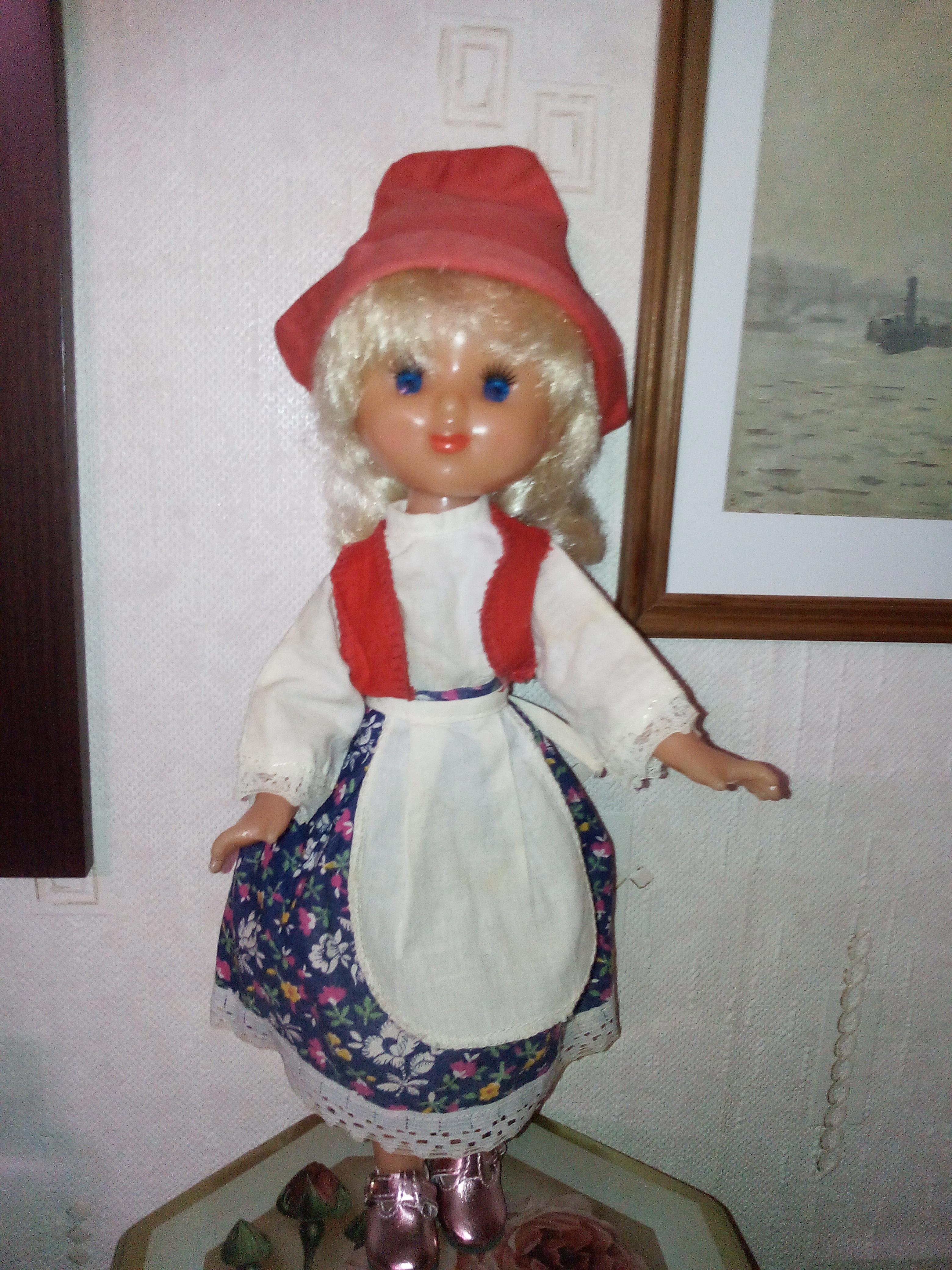 В статье на Бэйбиках рассказывали про эту куклу: но там она была в образе Золушки. с двумя комплектами одежды. Кукла совершенно та же, но у меня она в образе Красной Шапочки. Одежды на ней очень много, включая массивные панталоны, но за 35 лет она потеряла вид, и я куда-то дела её родные пластиковые сабо, так что на фото она в китайской покупной обуви. Я решилась полностью изменить ей имидж. Теперь она современная барышня.