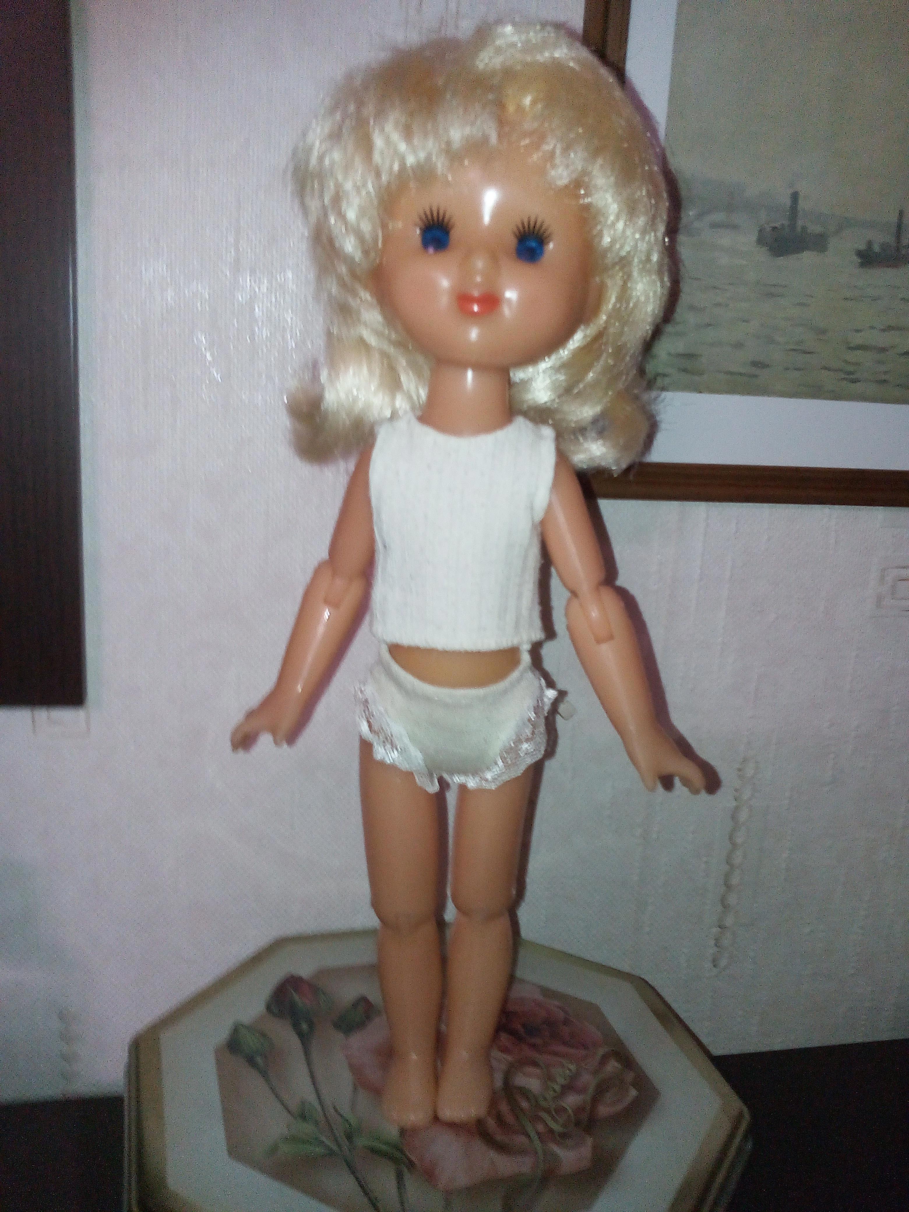 Автор: Наталия ИпатоваЧестно не помню, откуда у меня эта кукла, вероятно, кто-то отдал ненужное, но мне всё же кажется, что в мои руки она попала новой: одёжки накрахмалены. Весной этого года совершенно внезапно оказалось, что кукла редкая: это первая советская шарнирная кукла, выпущенная на Кировском заводе.