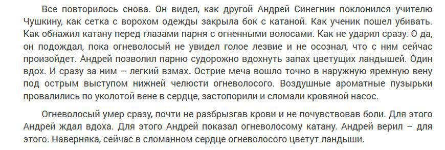 То есть тут всё, что я не люблю. И кострбатое сочетание пафоса с апофеозом романтизма при очень бедном словаре. Мизерный жизненный опыт, воплощаемый в текст через самое неподходящее место, совмещённый с метаниями угла подачи касаемо точки зрения и фокуса изложения среди ба-а-альшой толпы заместительных определений и прочие извращения и изыски, коие шваркались мне в глазюкалы на всём пути чтения.