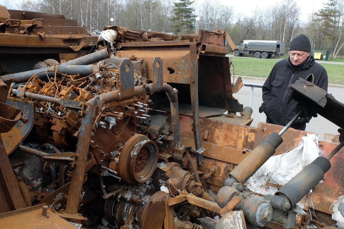 Май и пенсионер, рассматривающий сгоревшую иностранную технику на выставке "Фашизм. Невыученные уроки истории" у музея "Прорыв":