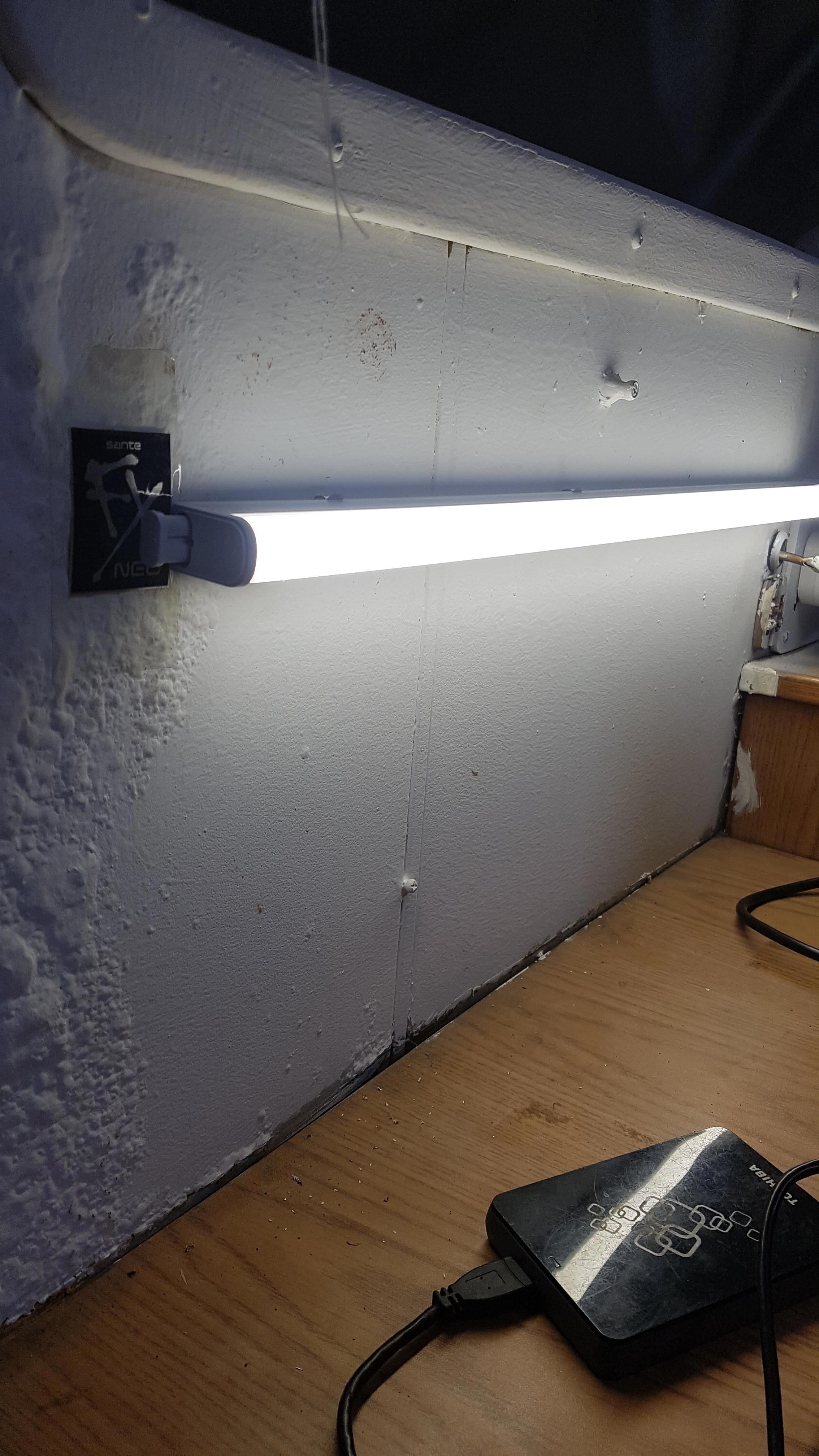 Перебрался в другую каюту. Состояние, так себе. Пузыри на переборке закрашены белой краской. Трогать ничего нельзя, обваливается ржавщина, зашить пока нечем. Над столом удалось установить светильник нового поколения. Так все просто. Вот только розеток не хватает. Лишний потребитель сразу дал о себе знать. Выбило предохранительный автомат на щите этой палубы. Это когда у меня только четыре розетки на одной линии. Ноутбук, кофеварка типа "турка", тут же или подзарядка для телефона или обогреватель, который приходится выключать из сети, хотя он с термореле. У других тоже много электроприборов, те же проблемы. Представляю, как там где-то провода греются.
