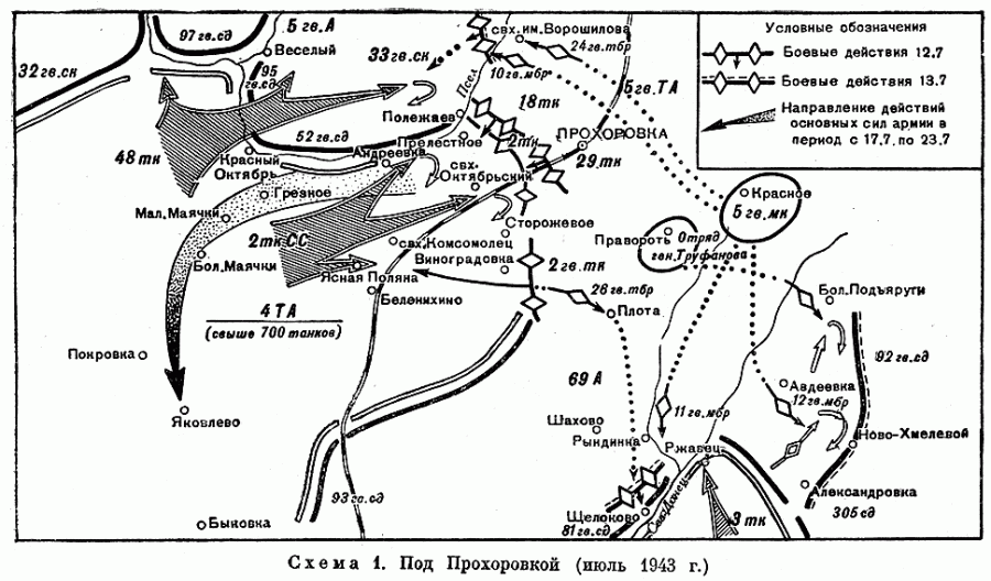 Железнодорожная станция прохоровка находилась на южном фасе Курской дуги. Не достигнув решающего успеха на Обоянском направлении, где оборона советских войск составила лишь около 35 километров, германское командование в соответствии со своими планами сместило острие главного удара в направлении Прохоровки с намерением выйти к Курску через излучину реки Псёл. Изменение направления удара было связано с тем, что согласно планам германского командования именно в излучине реки Псёл представлялось наиболее целесообразным встретить неизбежный контрудар превосходящих по численности советских танковых резервов. В случае, если до подхода советских танковых резервов захват Прохоровки обернулся бы провалом, предполагалось вообще приостановить наступление и временно перейти к обороне, с целью использовать выгодный для себя рельеф местности, чтобы не дать советским войскам реализовать численное преимущество охватив фланги 2-го танкового корпуса СС. Немецкое командование было намерено перехватить стратегическую инициативу и отомстить Красной Армии за поражение у посёлка Поныри, где с 7 по 11 июля проходили ожесточённые бои.