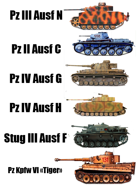 Немецкие войска под Прохоровкой сосредоточили силы второго танкового корпуса СС и третьего танкового корпуса, в составе которых числилось порядка 413 танков и САУ, в том числе: легкие танки Pz II, Pz III Ausf N (с дополнительным противокумулятивным бронированием), средние танки Pz IV (в основном Ausf G и H), тяжёлые танки Pz Kpfw VI "Тигр" и САУ Stug III.