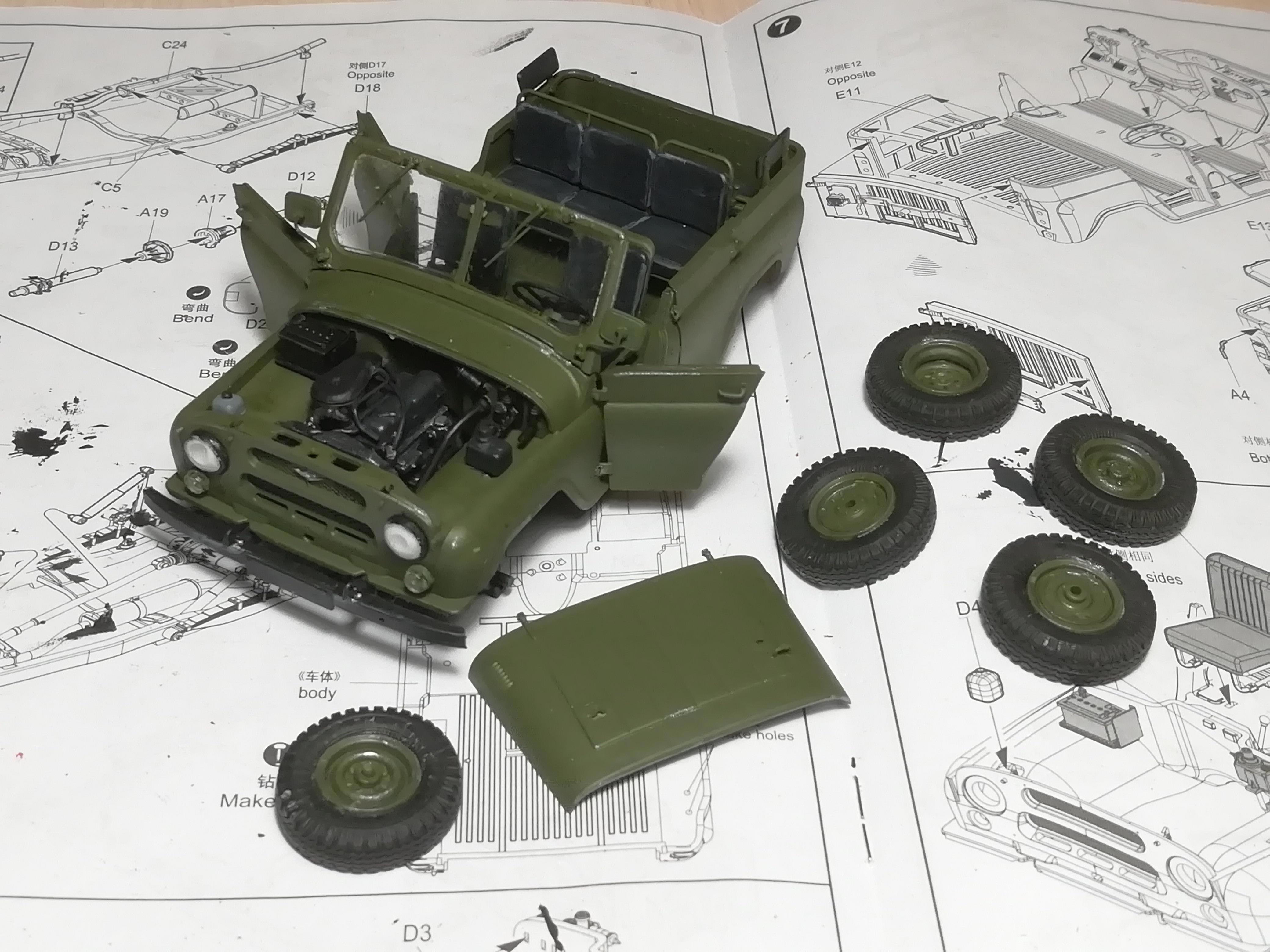 Тем не менее, как и собирался, позанимался "осенним" УАЗиком. Собственно, остались колёса и брызговики, ну и пыль-грязь. Благо аэрограф теперь есть - но надо попробовать на чём-то, что не жалко, около 30 лет пыль на моделях не делал :)