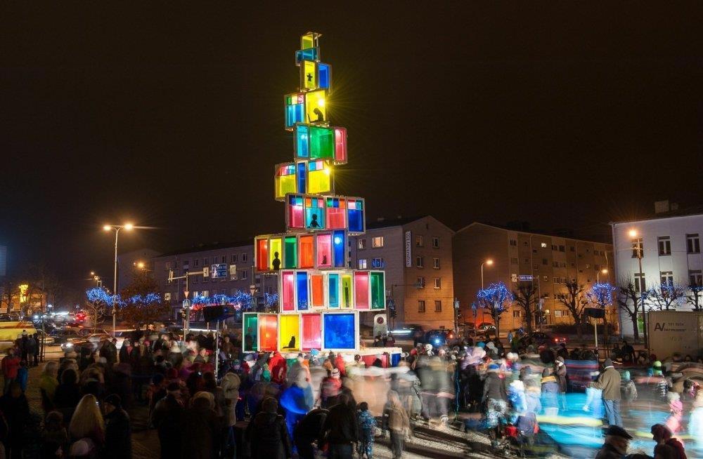 Оконная ёлка в Эстонии. В Раквере ёлку сделали из старых разноцветных окон.