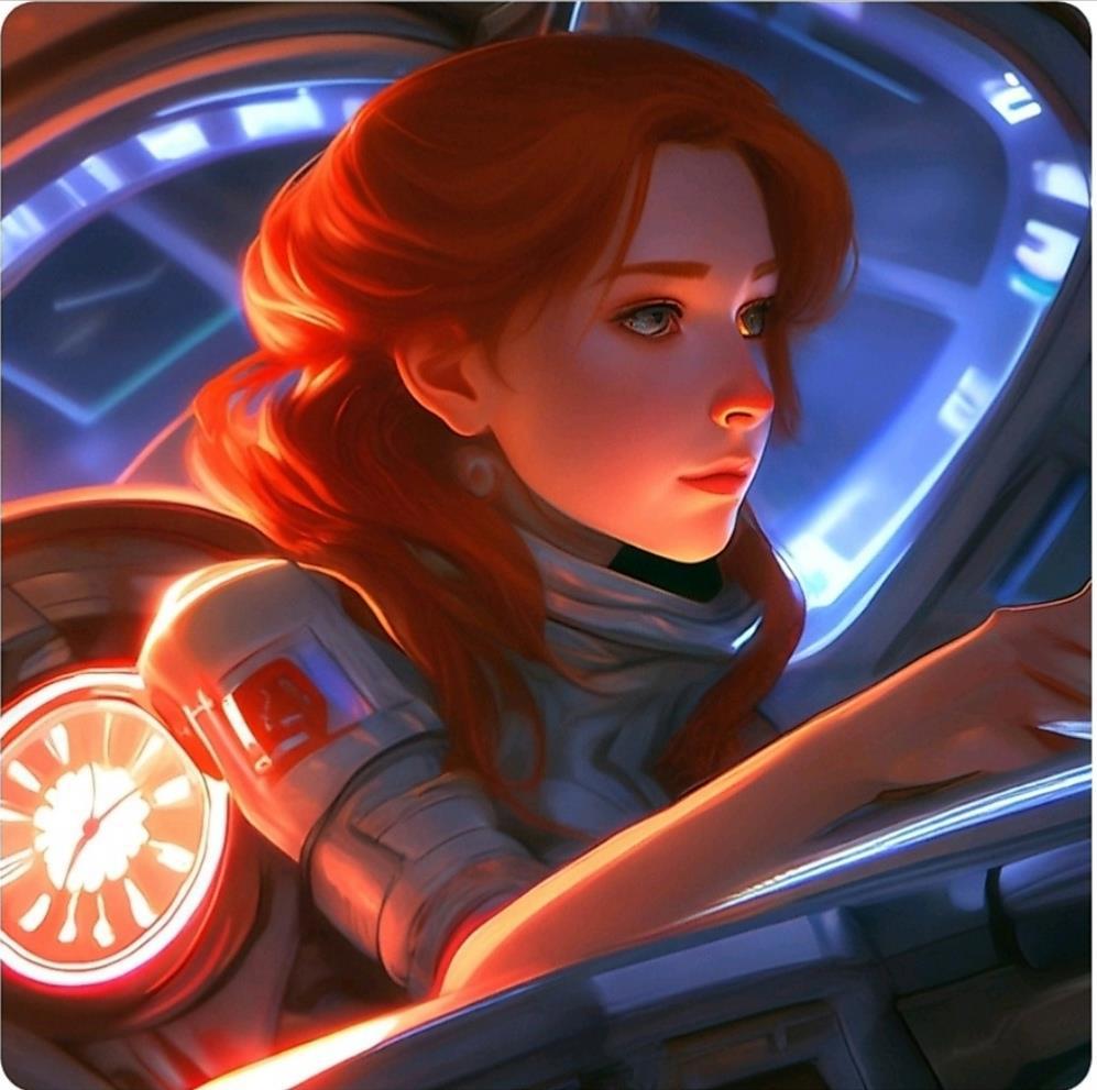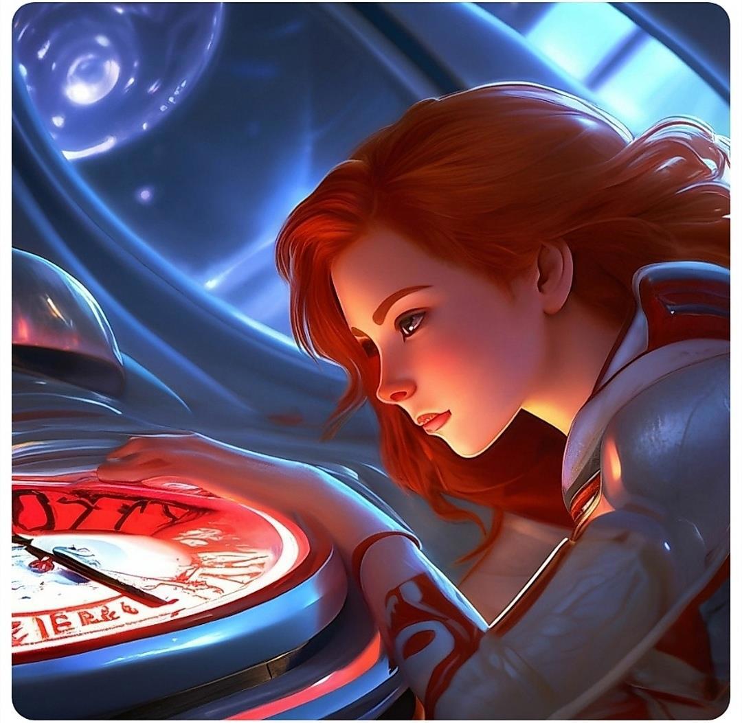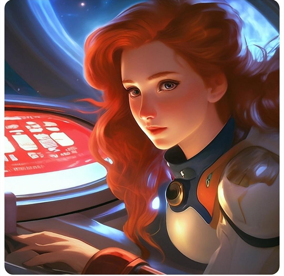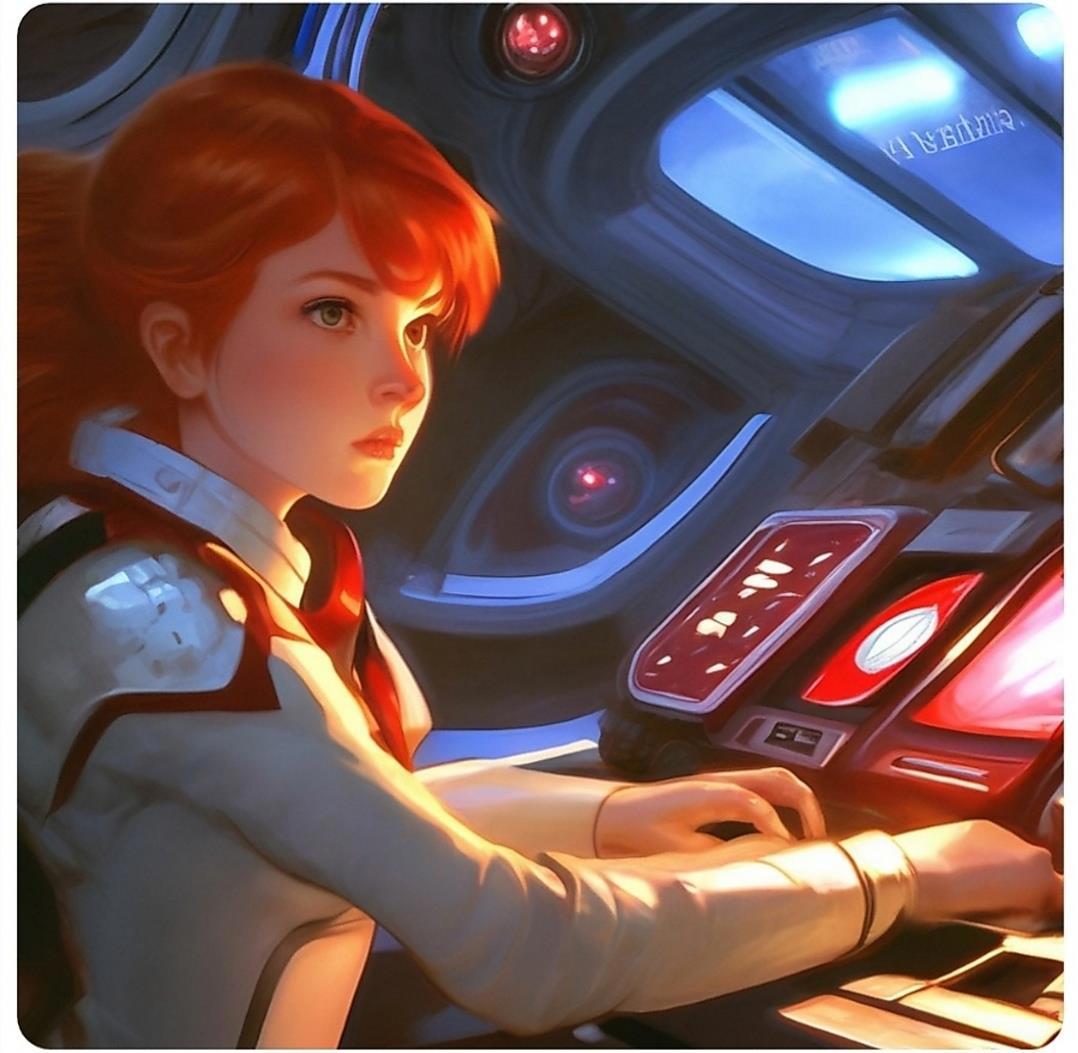 << В центре выгнутого пульта звездолёта выделялся широкий и багряный циферблат. Над ним опираясь на расставленные руки наклонилась выгнув тонкую спину рыжеволосая русская девушка. Красный отблеск сделал старше и суровее юное лицо, очертил резкие тени вокруг выступавших полноватых губ, заострил чуть вздёрнутый нос. Широкие нахмуренные брови стали глубоко-чёрными, придав глазам сумрачное выражение. В золотистом свете искрились густые тёмно-рыжие волосы девушки. >>