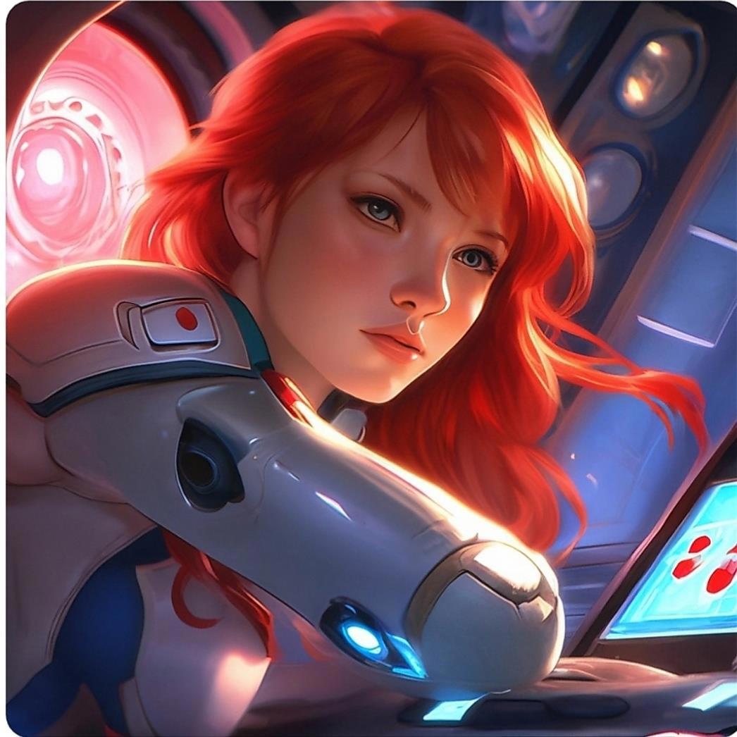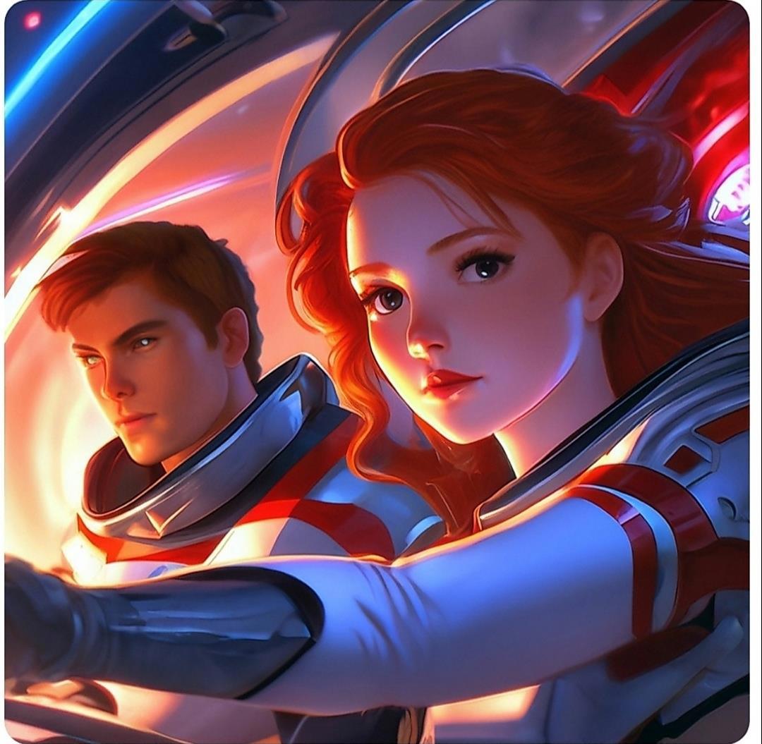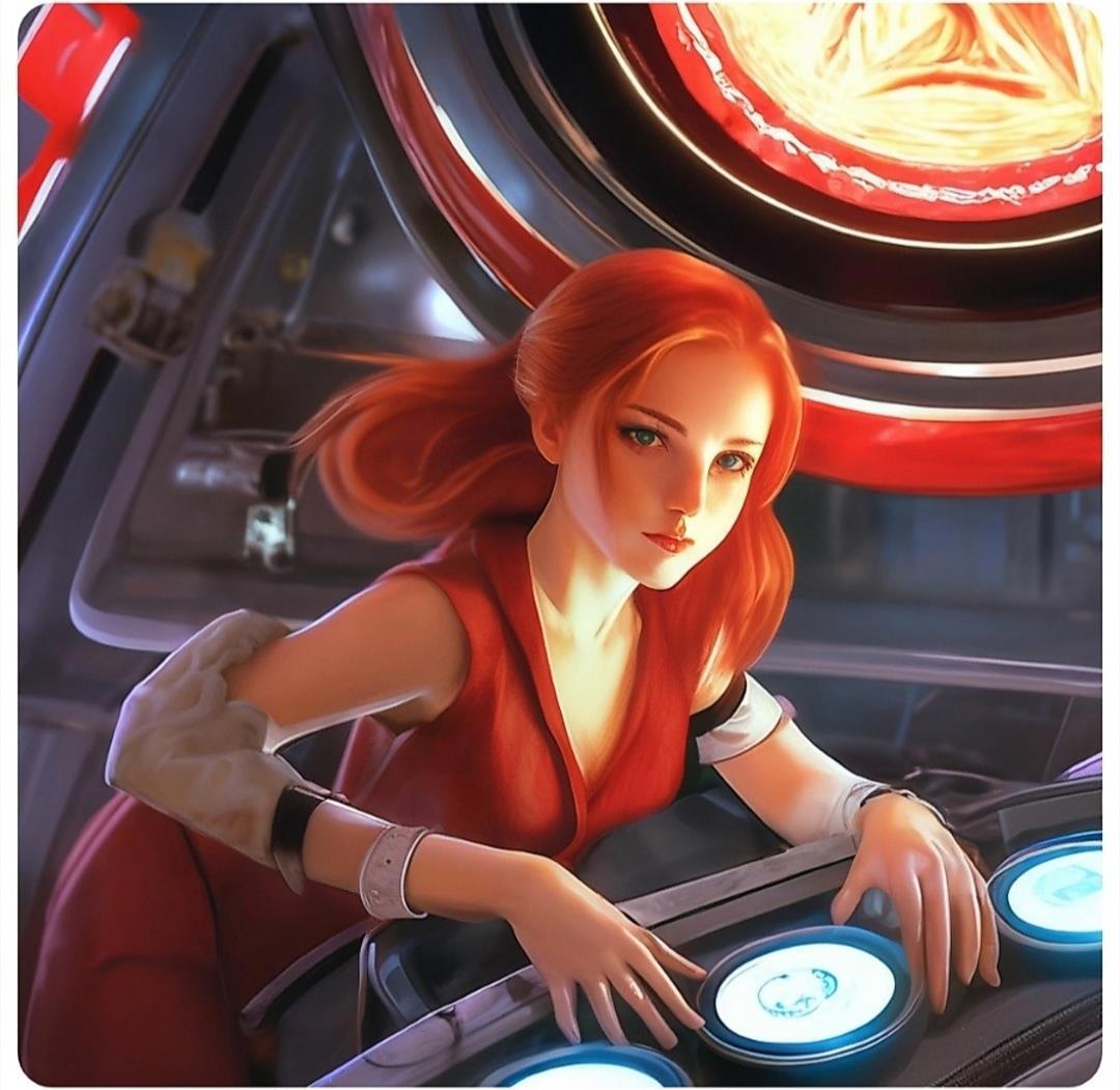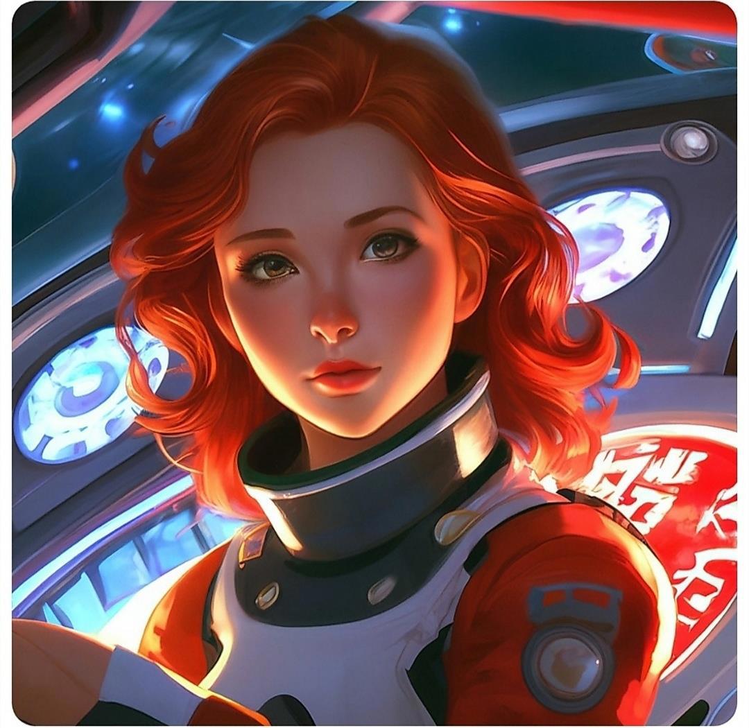 << В центре выгнутого пульта звездолёта выделялся широкий и багряный циферблат. Над ним опираясь на расставленные руки наклонилась выгнув тонкую спину рыжеволосая русская девушка. Красный отблеск сделал старше и суровее юное лицо, очертил резкие тени вокруг выступавших полноватых губ, заострил чуть вздёрнутый нос. Широкие нахмуренные брови стали глубоко-чёрными, придав глазам сумрачное выражение. В золотистом свете искрились густые тёмно-рыжие волосы девушки. >>