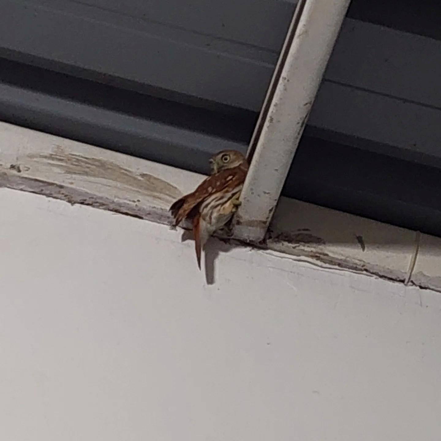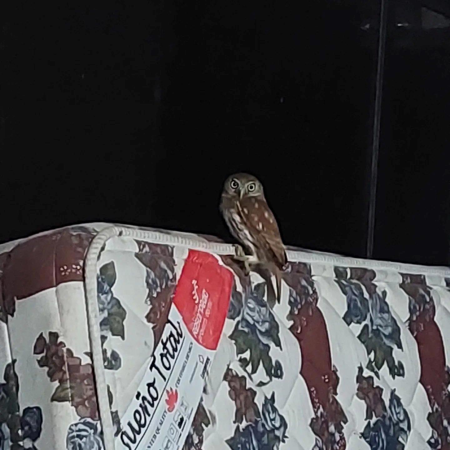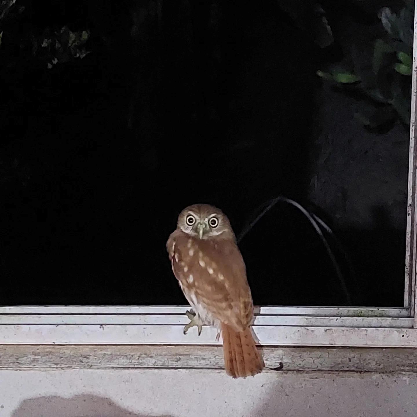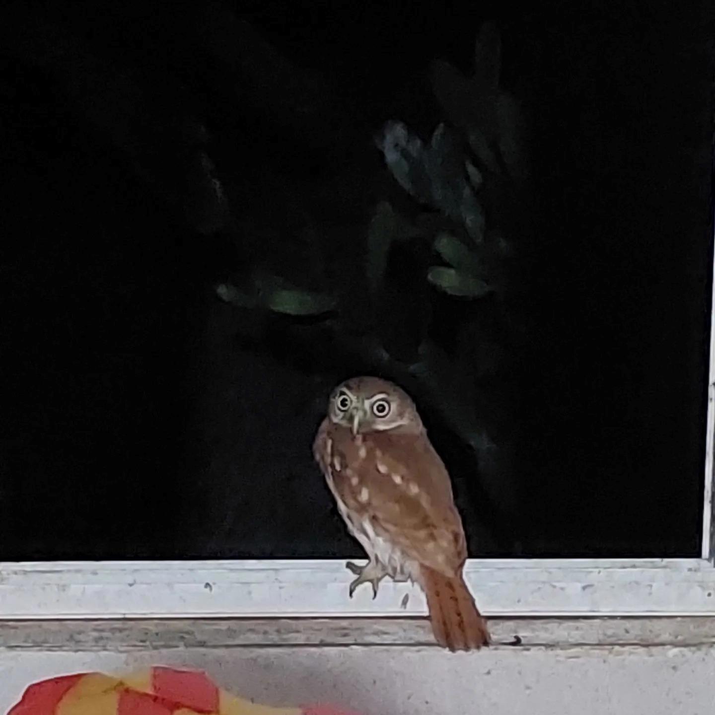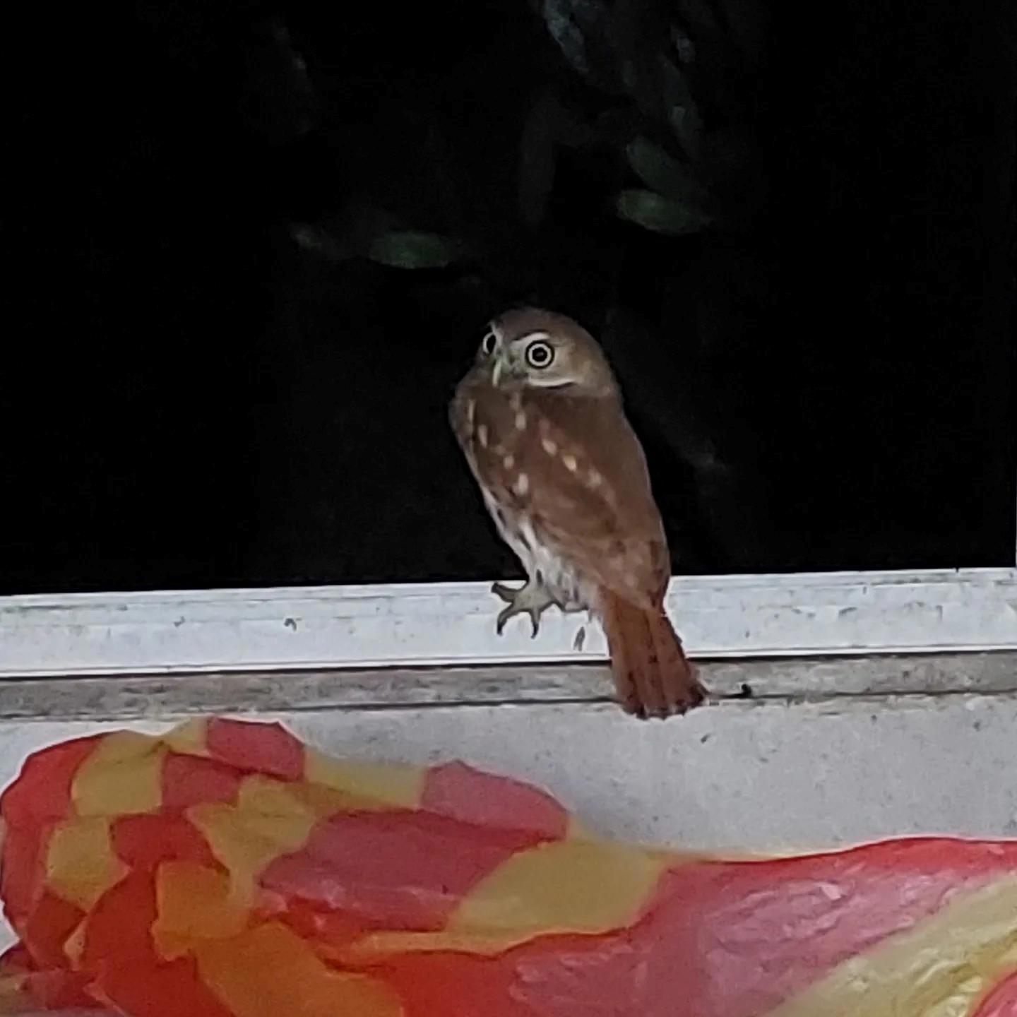 В общем сидела за компом, никого не трогала. Вдруг в окошко влетает нечто маленькое: см 15 в высоту и в ладонях уместилась бы легко. Поначалу заподозрила летучую мышку, но тут неопознанный поначалу ночной гость нашел, куда приземлиться, и глянул круглыми желтыми глазищами.