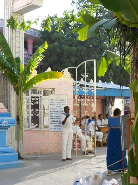 Это ворота в ашрам. Люди в белой форме охрана. Существует как мужская, так и женская охрана. Правила пребывания в ашраме, очень строгие.