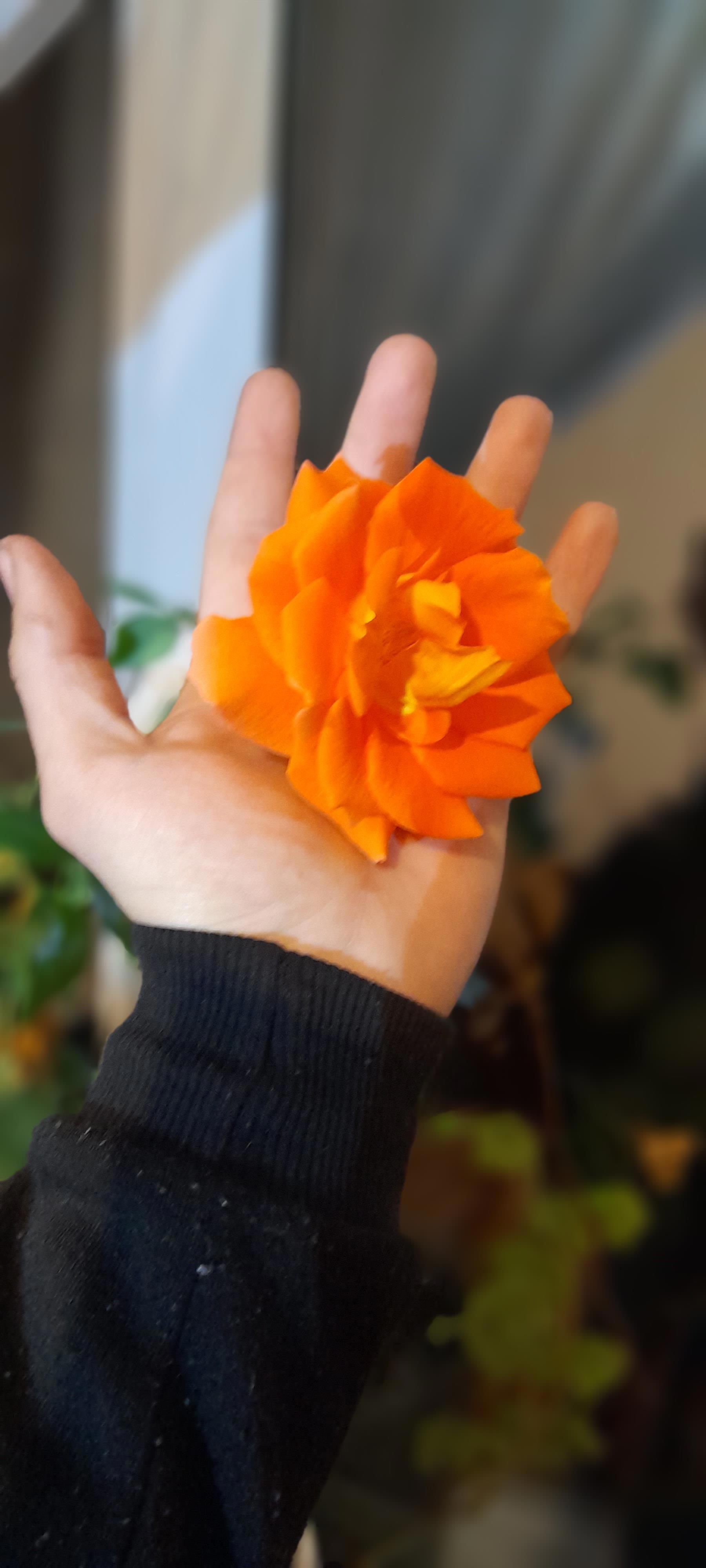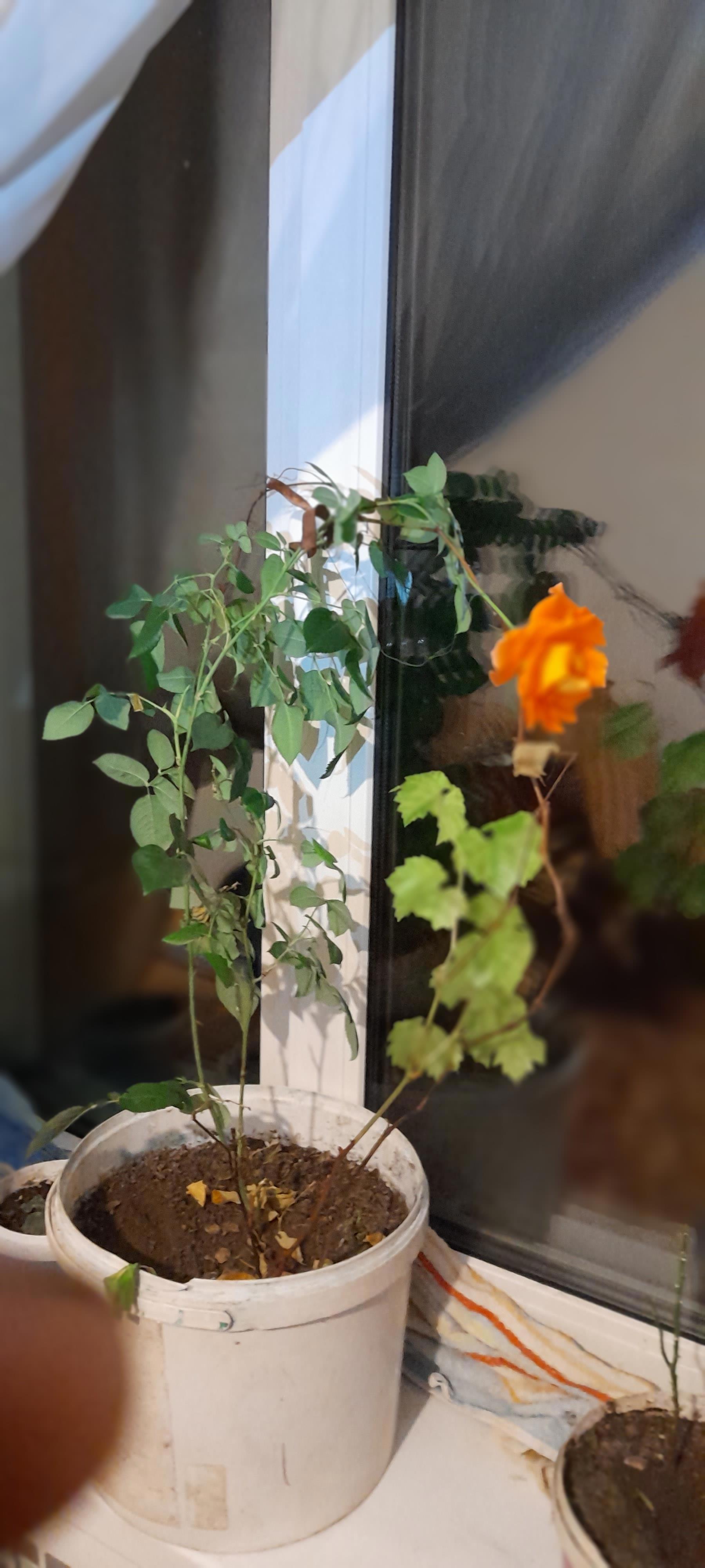 Хрупкая, нежная? О, нет. Вовсе нет. У этой розы такая долгая история, точней у её родительницы. Этой-то вроде всего пару лет(не так давно мама подсунула)), но видимо она впитала всю суровость предков, которые умирали под палящим солнцепеком, увядали от холода и тени, чахли от тесных горшков и сухости, выживали после того, как их объедали коровы и овцы. В итоге кустик высотой в полметра имел несгибаемый одервеневший ствол в палец толщиной, жесткие листья, будто картонные, но так и не отрастил шипов... хотя я видел, что молоденькие и зеленые у него были. То ли сорт такой, то ли просто не стал на них заморачиваться.