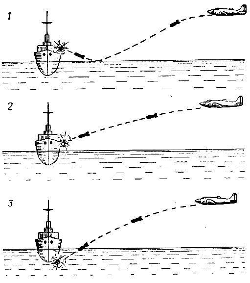 Было три возможных вариантов поражения кораблей: 1) попадание бомбы с рикошета; 2) прямое попадание в корабль; 3) взрыв бомбы под килем корабля:Первые два варианта поражения эффективны при бомбометании по небронированным или слабо бронированным кораблям. Если толщина брони свыше 25 мм, наибольший эффект дает третий вариант, так как сила взрыва крупной фугасной бомбы под килем (дно кораблей не бронируется) для его поражения достаточна. В зависимости от класса корабля и избранного варианта поражения должны выбираться соответствующая высота сбрасывания бомб: от 10 до 3О м в первых двух случаях и от 50 до 100 м в расчете на взрыв бомбы под килем корабля (при таких высотах бомба уже не рикошетирует, а, уйдя под воду, продолжает некоторое время зигзагообразное движение в направлении полета самолетов в момент сбрасывания и затем взрывается).
