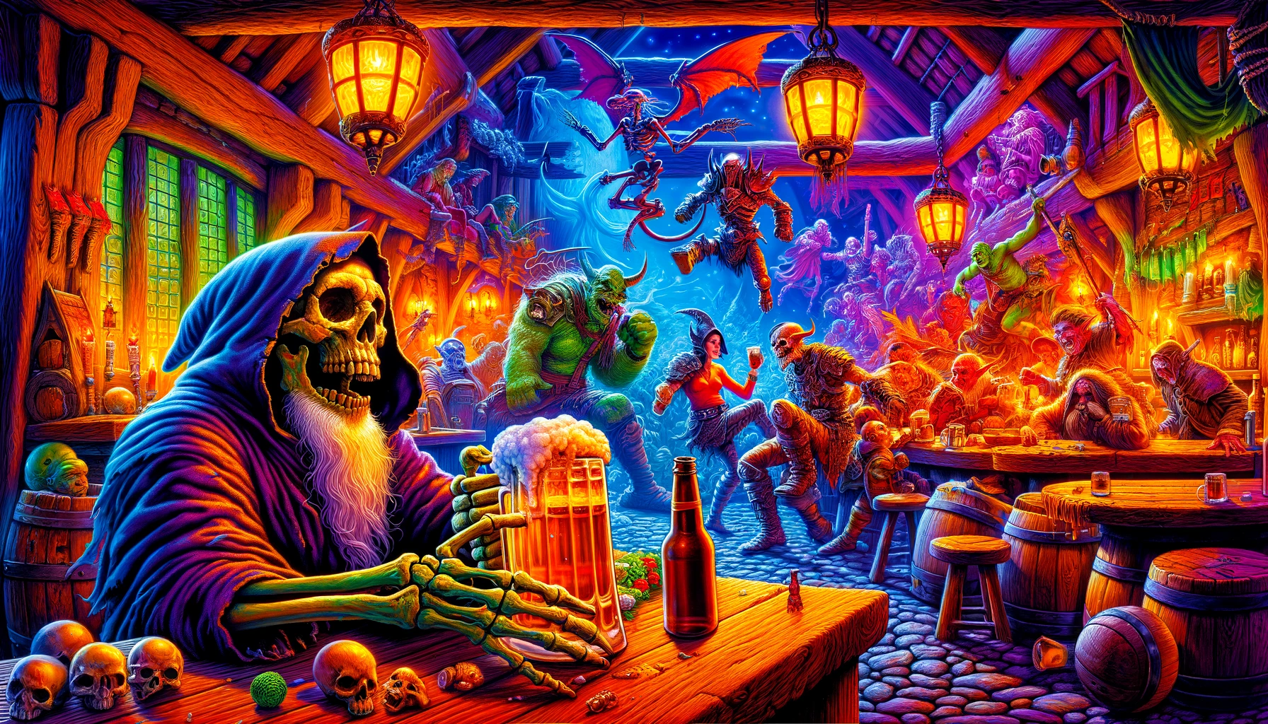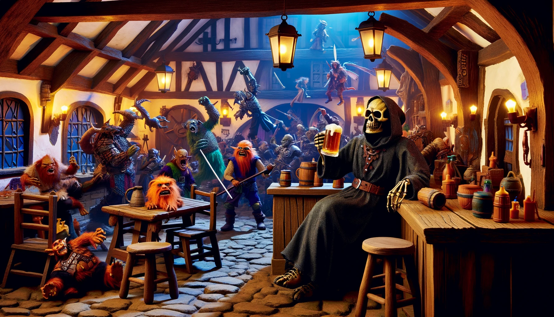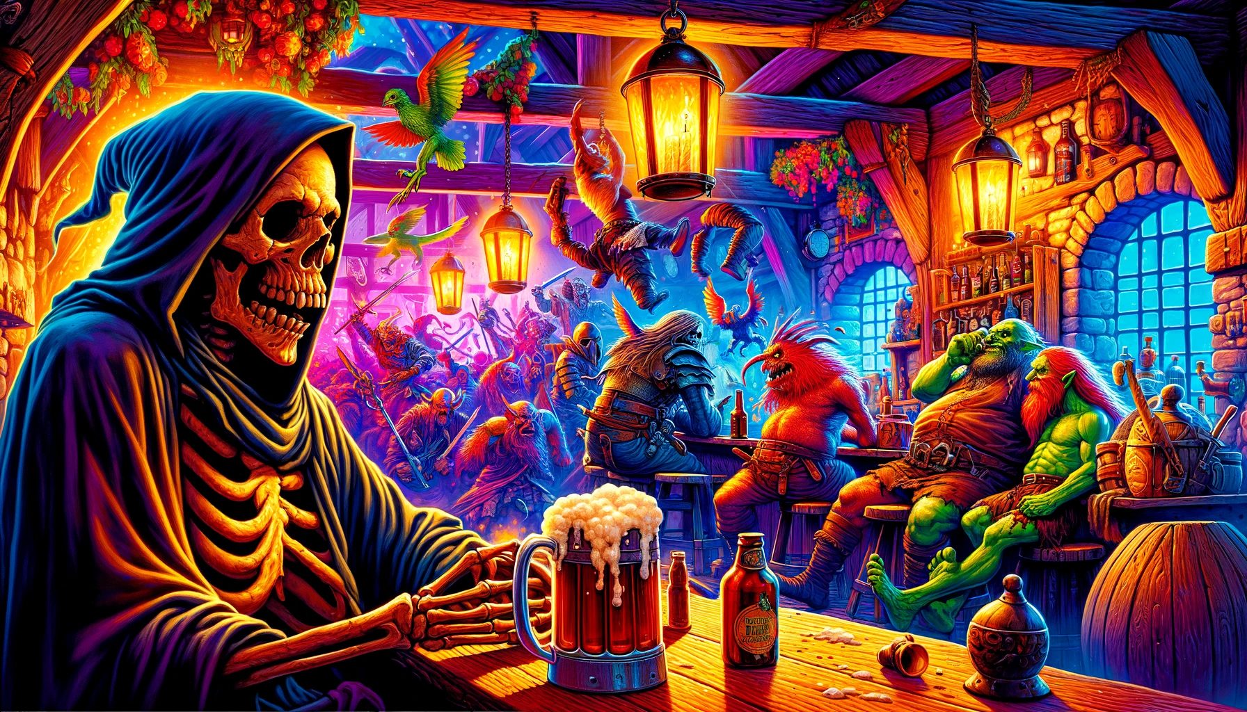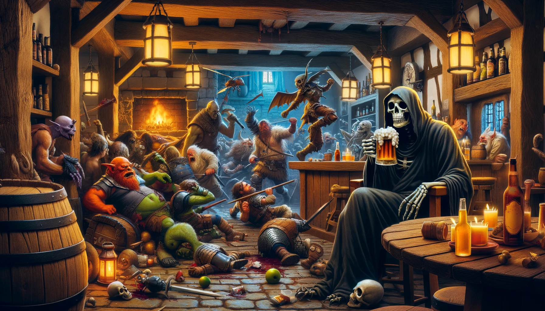 Нарисуй Смерть из Терри Прачетта. Он пьет пиво в таверне. В самой таверне драка между разными существами.