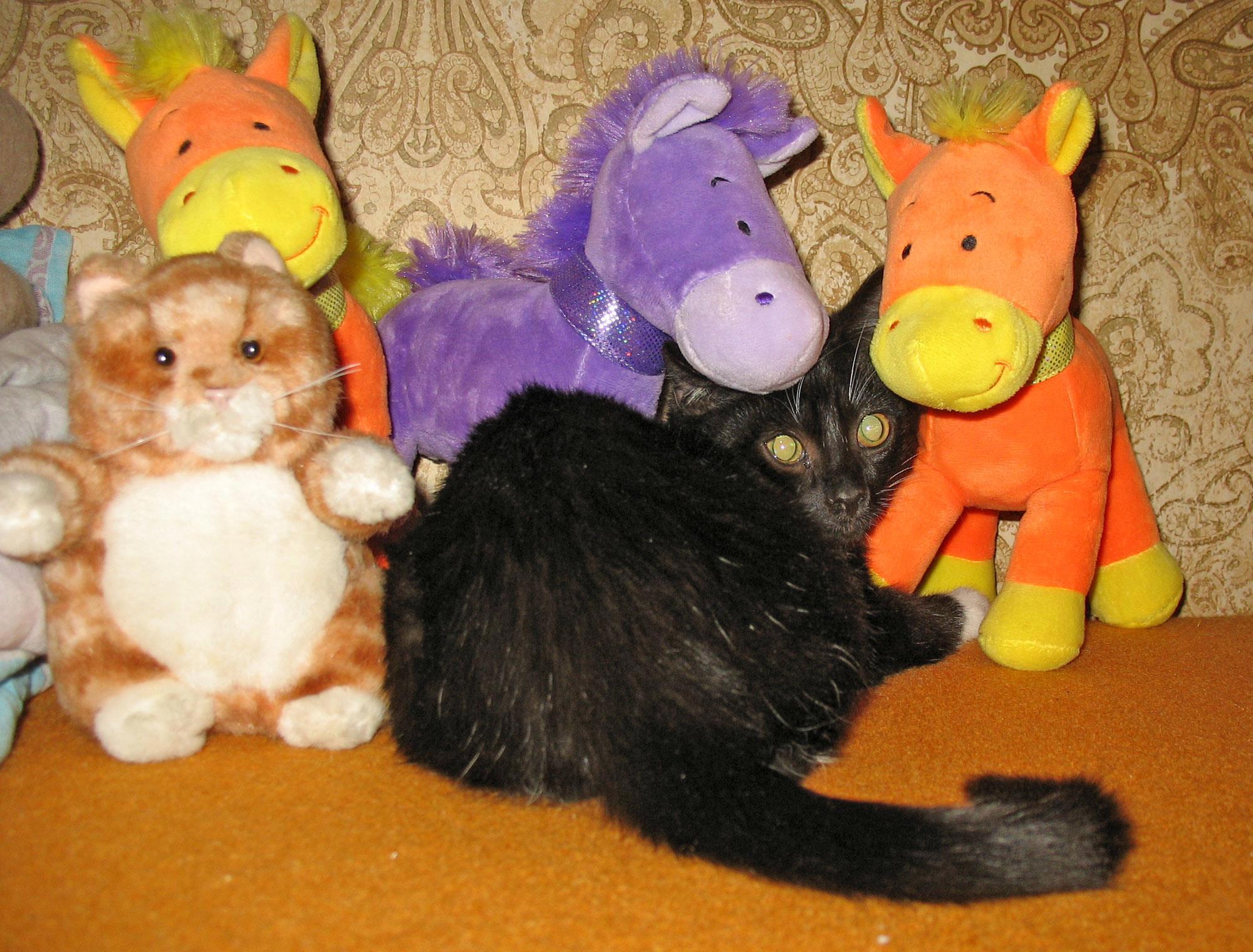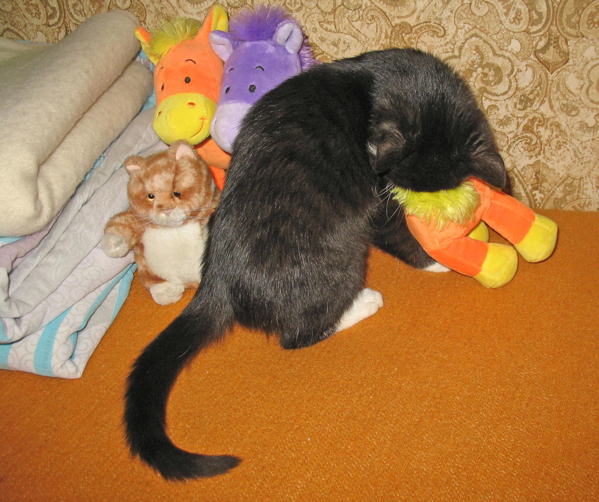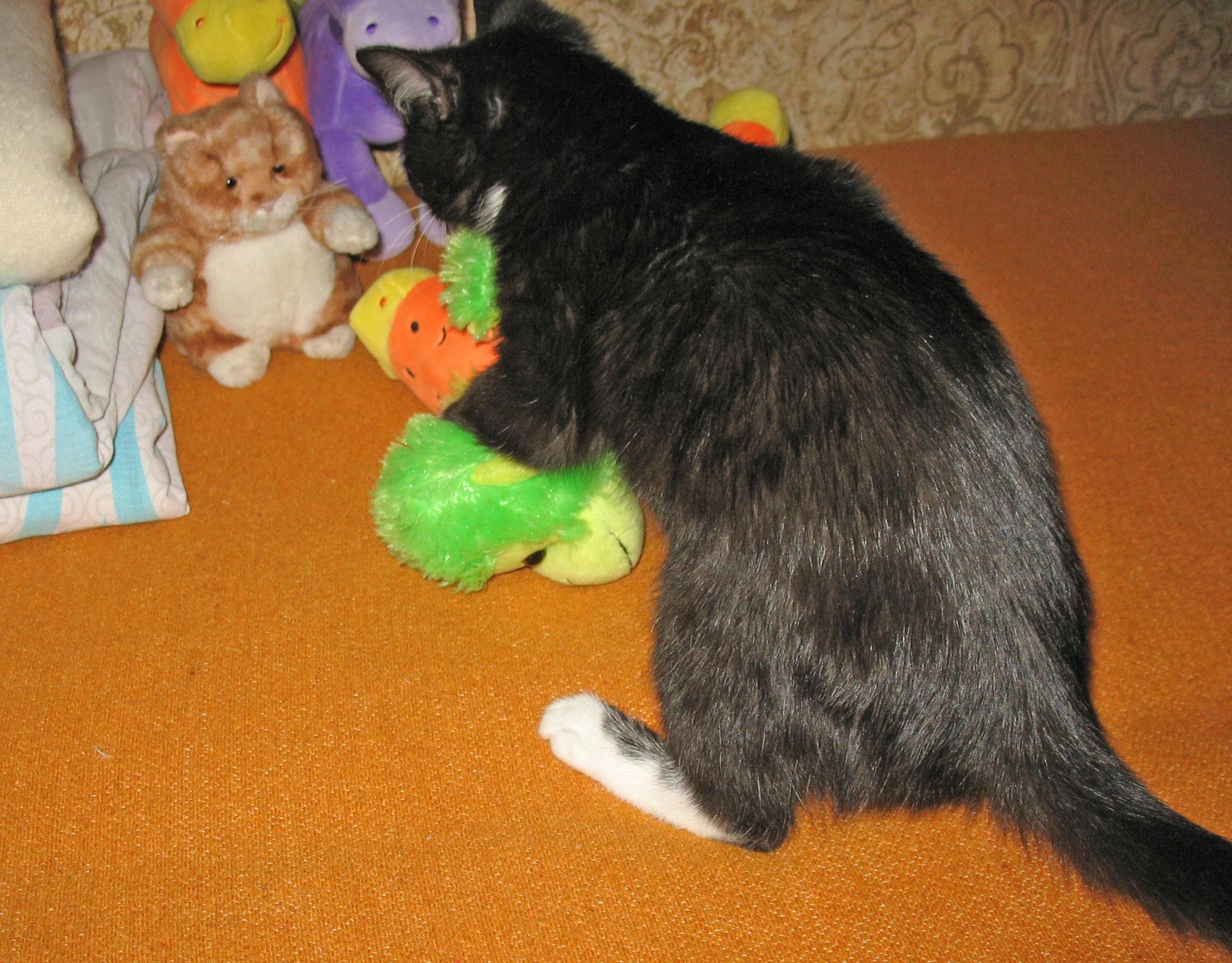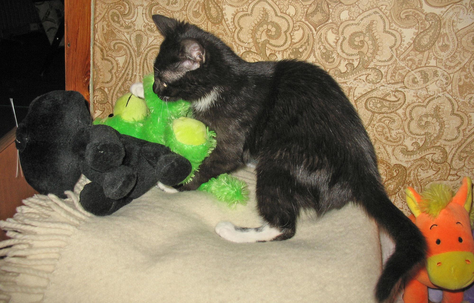 Мурчик и его игрушки. Здесь Котику 6 месяцев и, как все дети, он любит играть в игрушки. Со временем любимой у него осталась обезьяна. С ней он играл до самого последнего месяца своей жизни. И самое интересное, что не порвал за 6 лет, она и сейчас цела.
