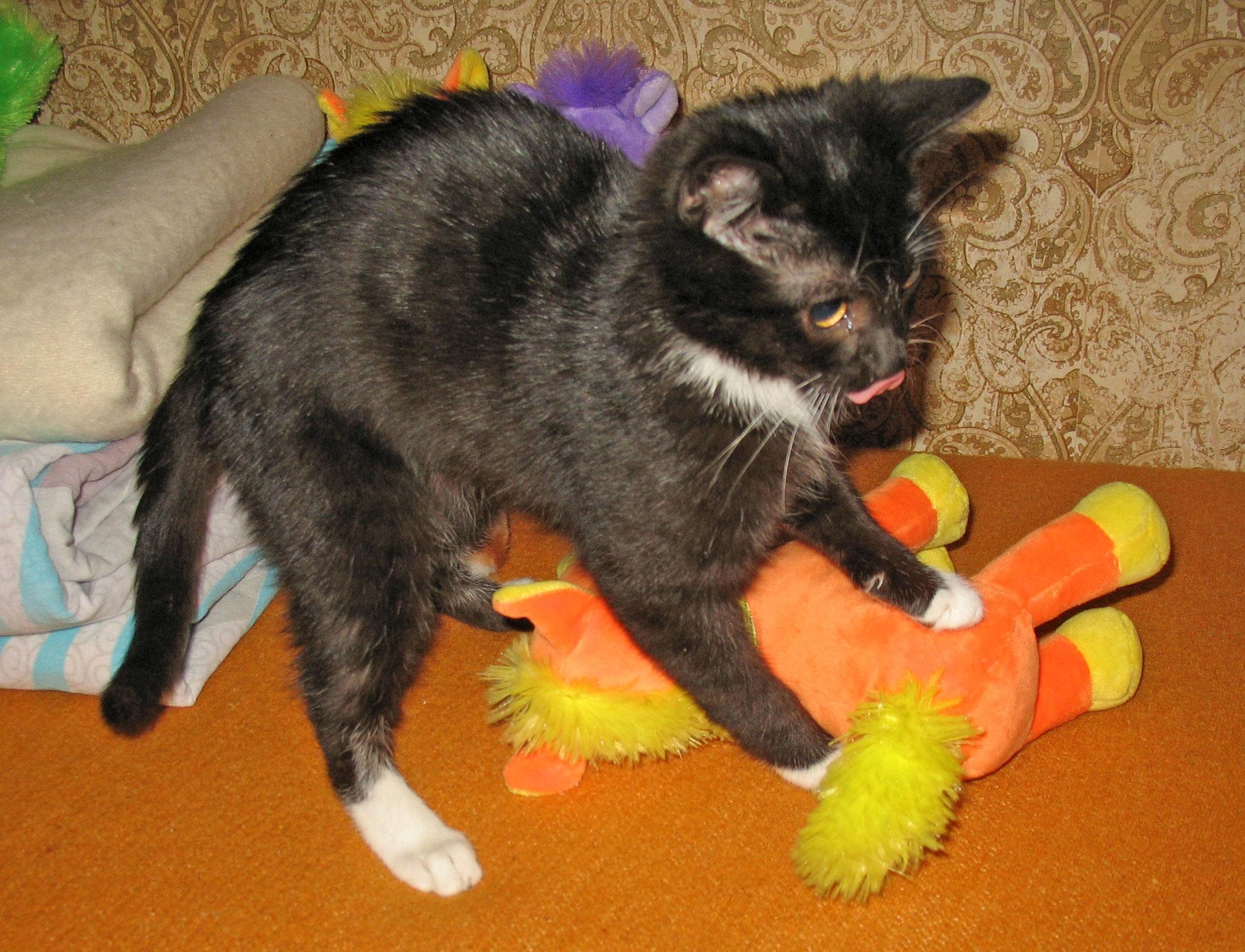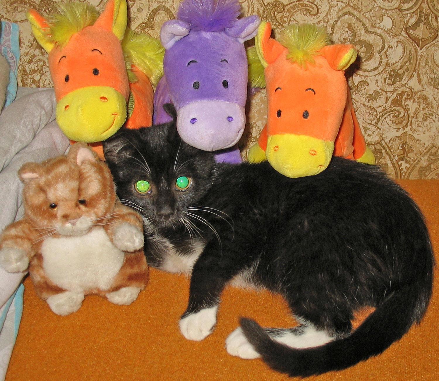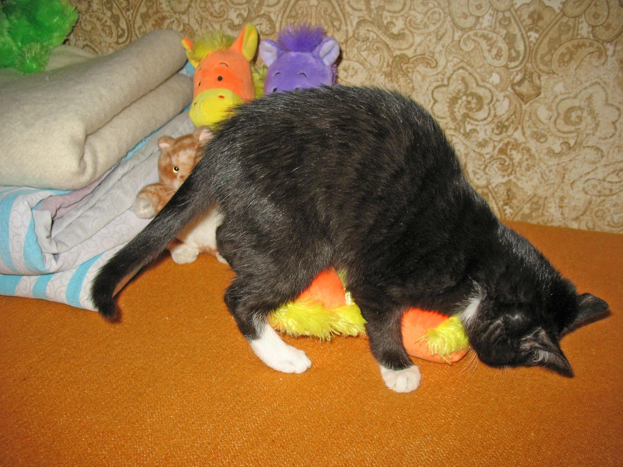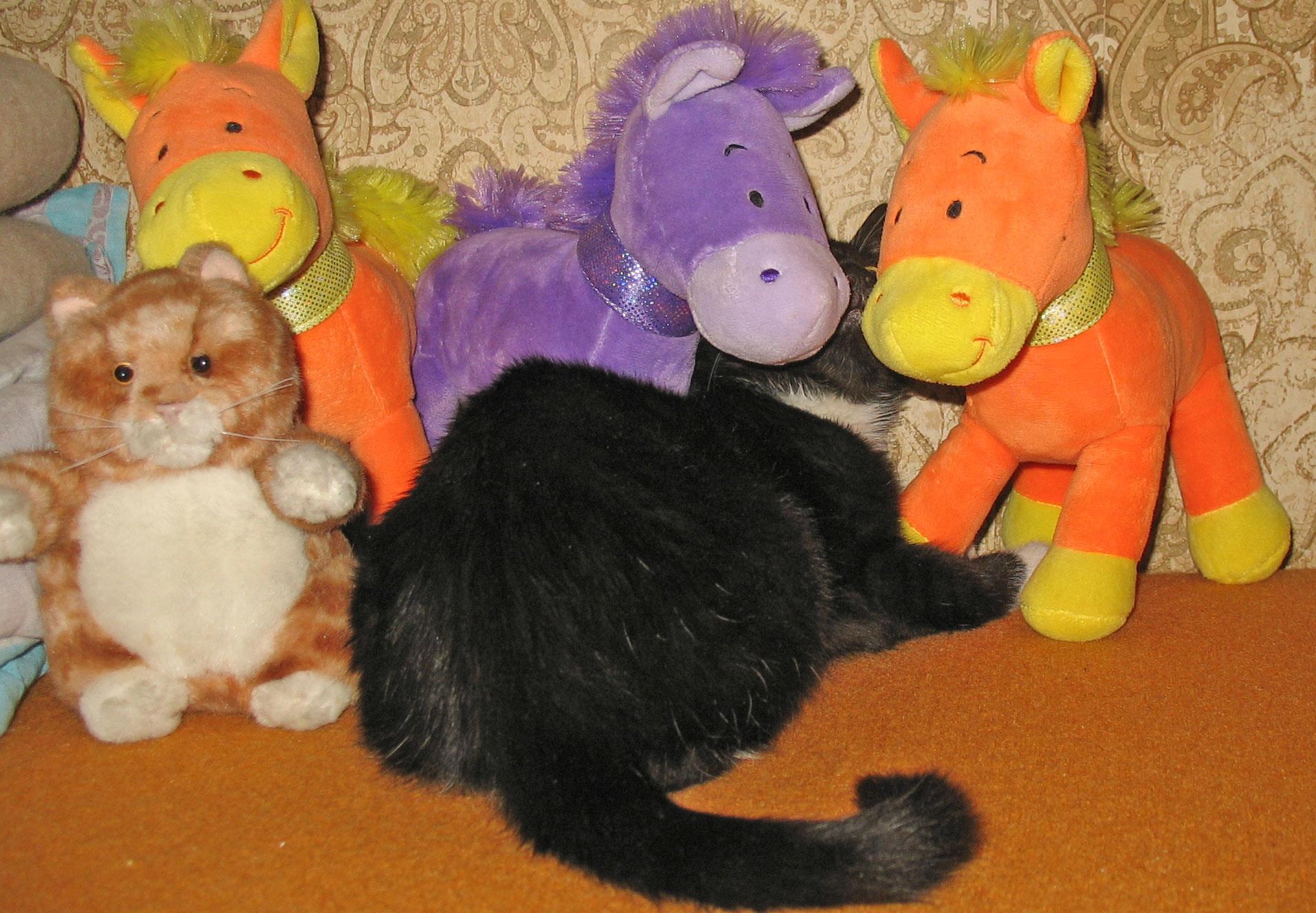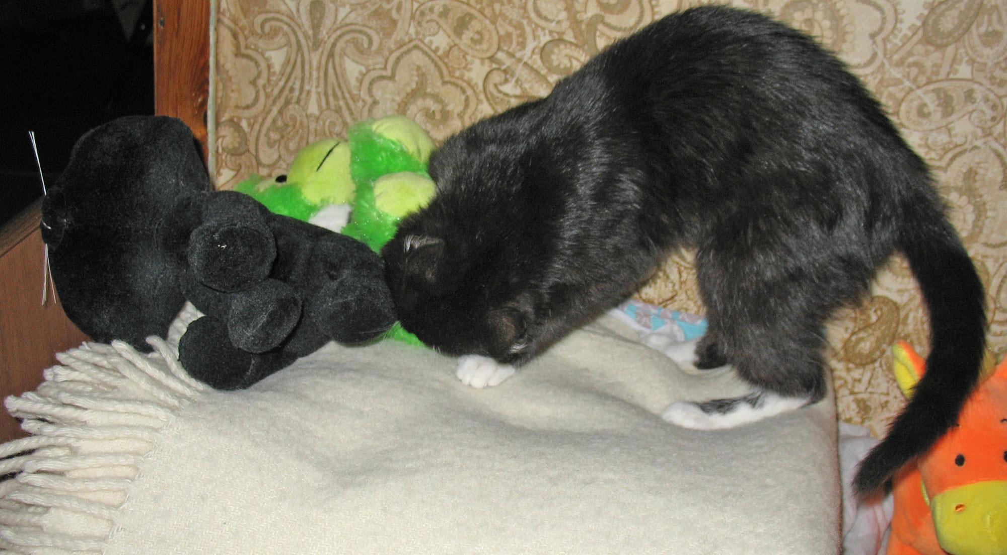 Мурчик и его игрушки. Здесь Котику 6 месяцев и, как все дети, он любит играть в игрушки. Со временем любимой у него осталась обезьяна. С ней он играл до самого последнего месяца своей жизни. И самое интересное, что не порвал за 6 лет, она и сейчас цела.
