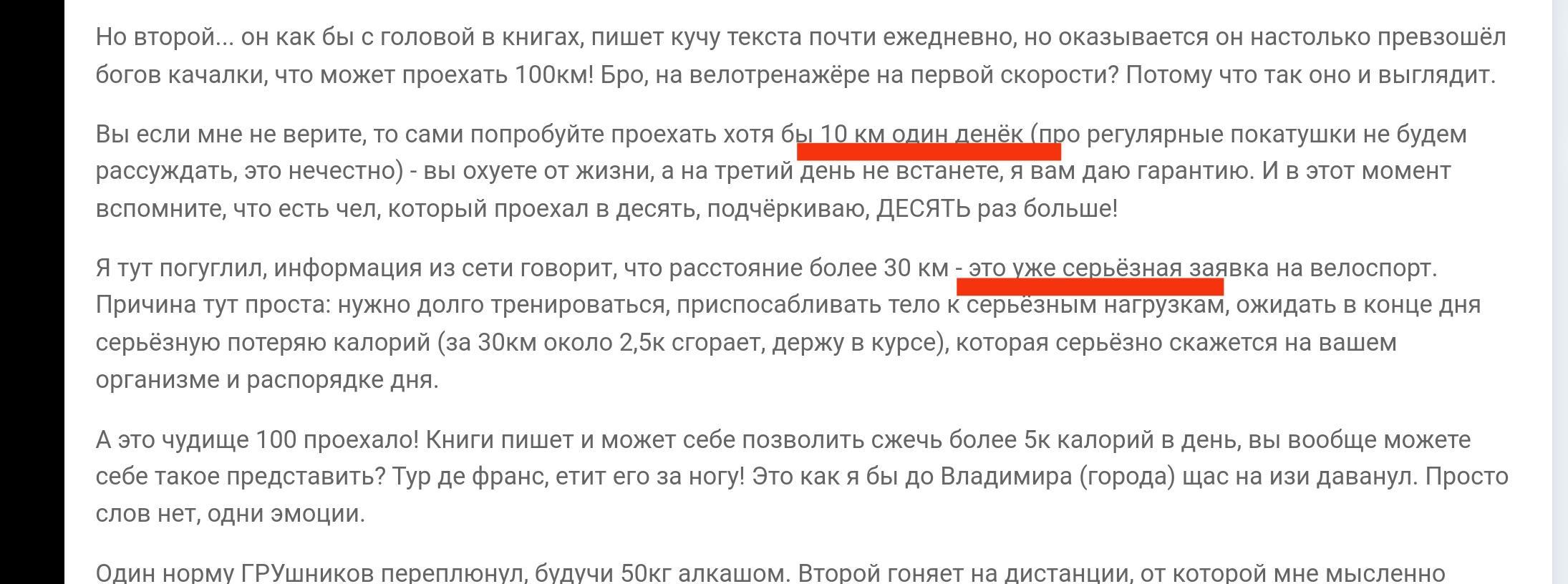 На вот, товарисч, убедись, что проехать на велосипеде 30+ км. не сложно. А если ты пропитый бурдюк, неспособный прожить без сигареты и пяти минут, так это исключительно твоя проблема.