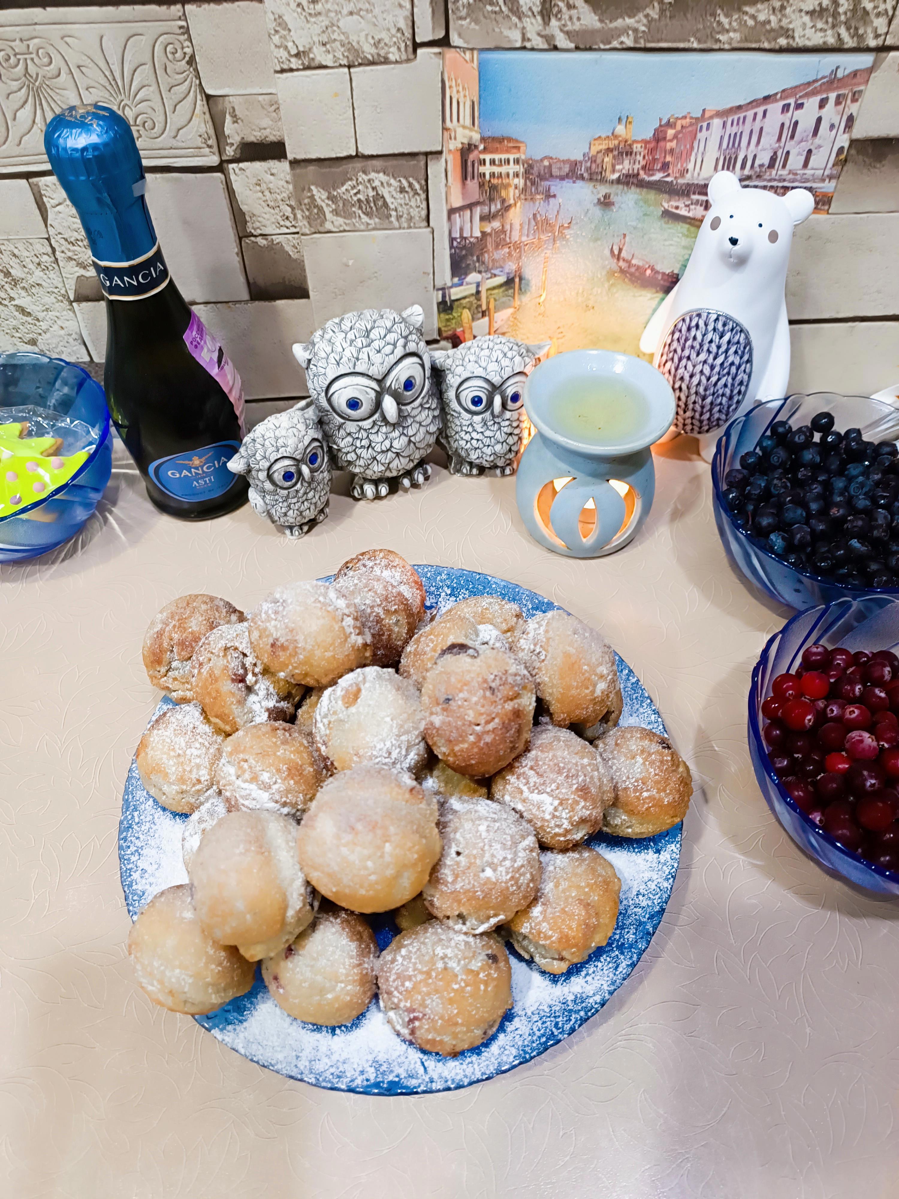 Некрасиво растаявшую малину я определила в пончики. Они стали какие-то тёмные и странные, но вкусные!)