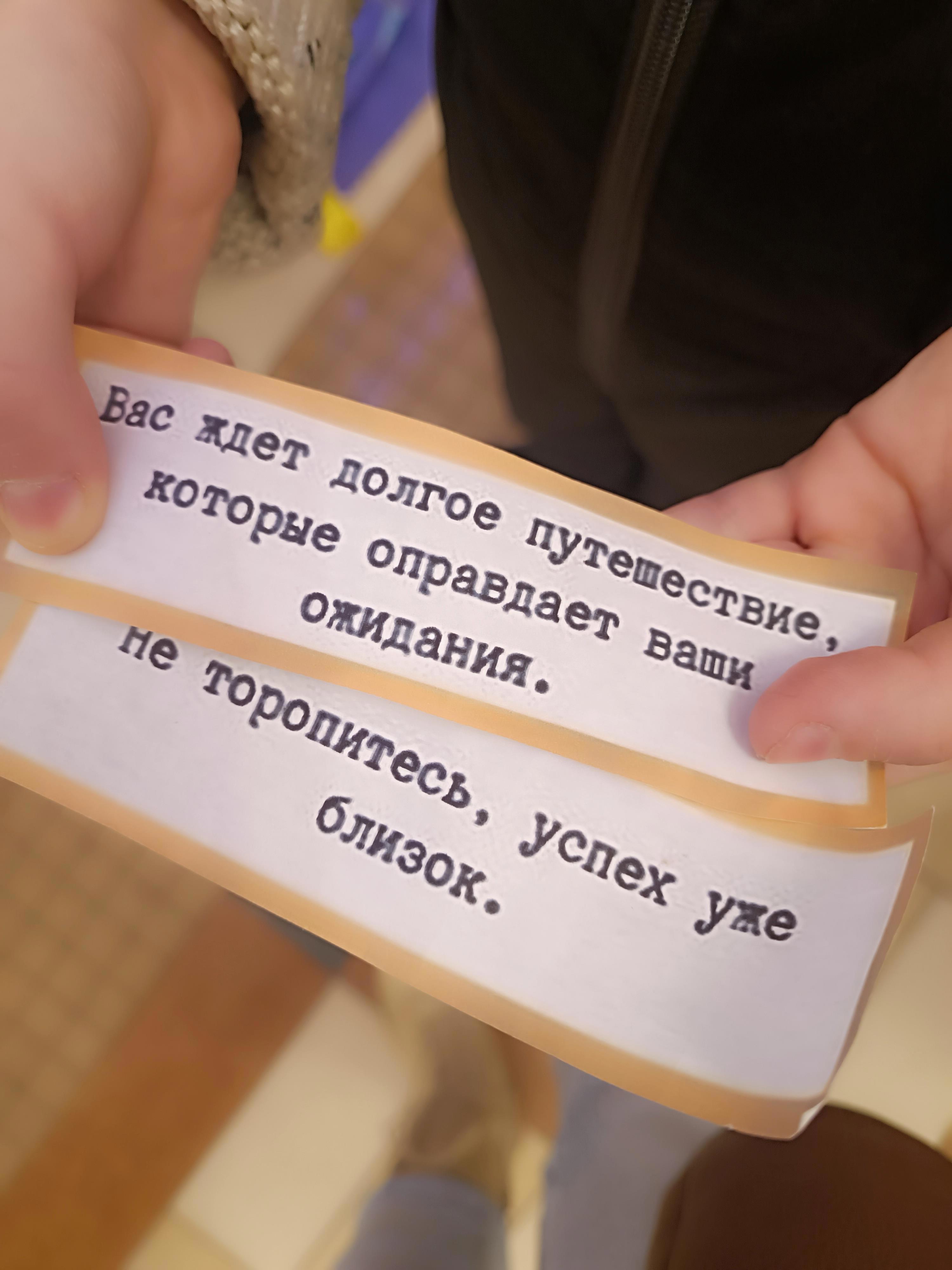А сегодня я ходила с несколькими маленькими родственниками в театр. Там перед спектаклем было представление, как положено, со сказочными героями, дедом Морозом и прочими его помощниками. Из шара с предсказаниями достала вот такие (случайно в рулончике их оказалось два!)