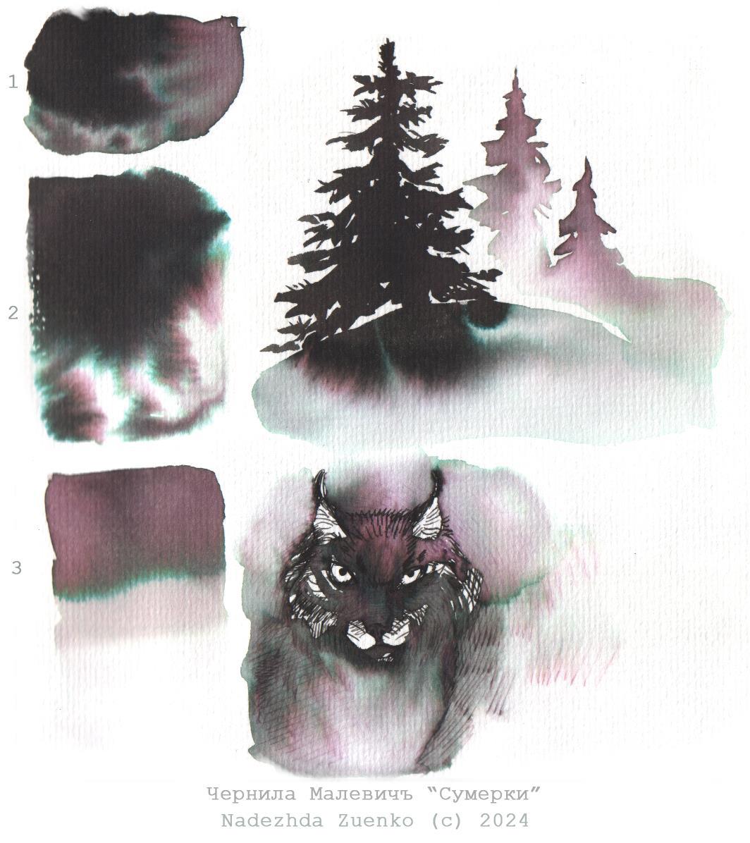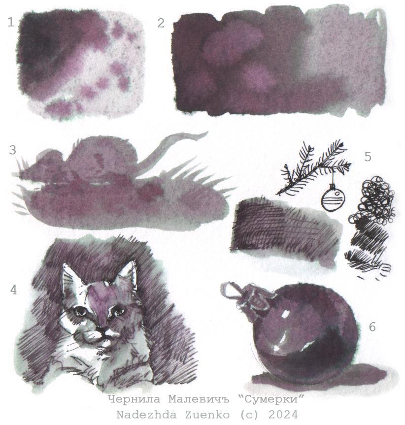 4. Ёлки решила попробовать кистью. Есть у меня тонкая каллиграфическая тех же Малевичей №3. Я ее всё время с чернилами юзаю из-за ее игольного кончика. Шоколадность неразведенных чернил - огонь. Разведенная водой розовость - порадовала. Кажется, я начала понимать, как оно работает :). Когда хочется розового, нужно просто отдельно наводить нужную консистенцию. и ее уже тогда можно и растянуть, зелень не полезет. Она только из максимальной плотности выпадает, видимо.