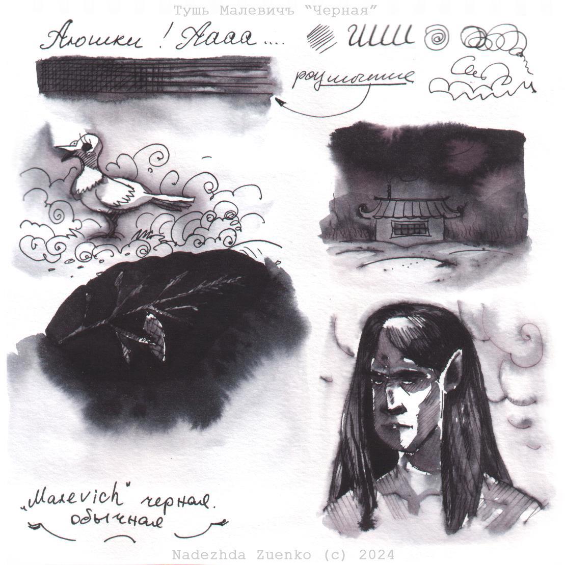 6. Проверила, можно ли рисовать чернилами как акварелью а-ля гризайль. Сразу всё пошло не так: всё поплыло, в светлоту не получилось, темноты еле-еле в несколько натыкиваний в сырое неразведенными чернилами набрать удалось.
