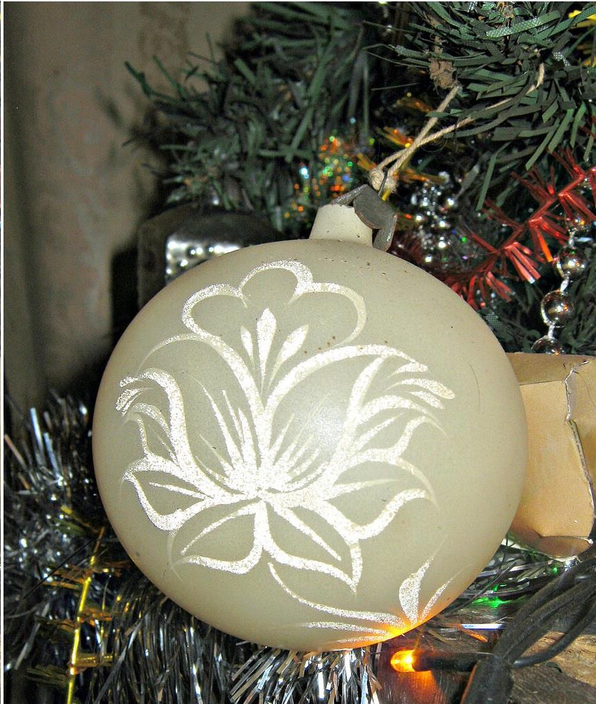 Кроме молочно-белого (изрядно потемневшего за три с лишним десятка лет) были ещё нежно-зелёные, розовые, небесно-голубые и светло-сиреневые. Но не исключено, что из всего этого набора выжил только этот шар. Что поделаешь - стекло. Оно плохо переносит переезды и падение елочек... Не то, что пластик.
