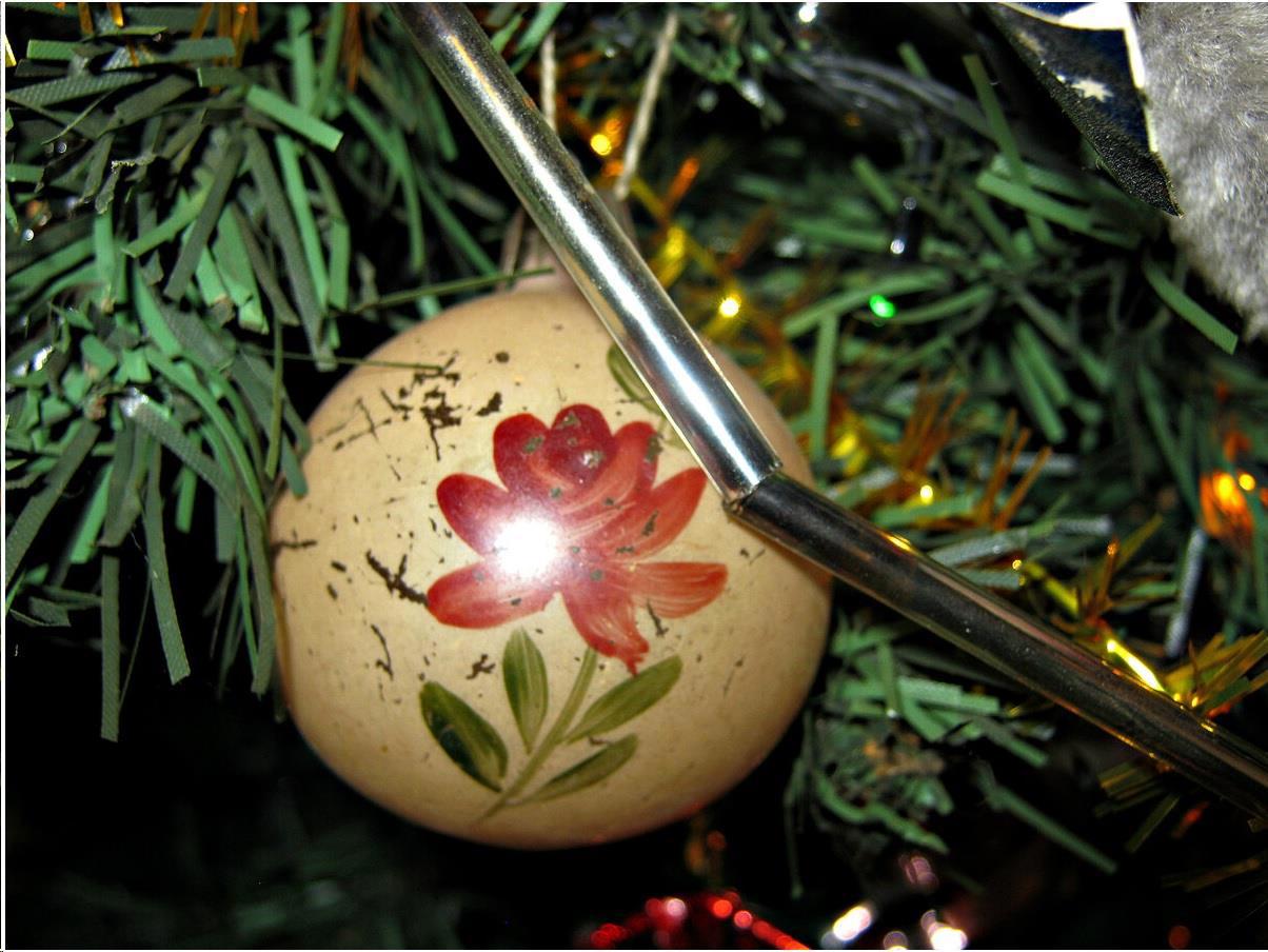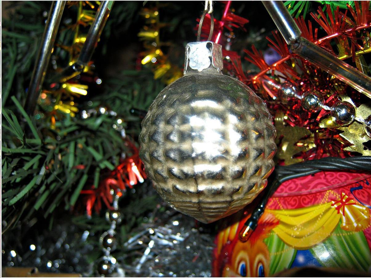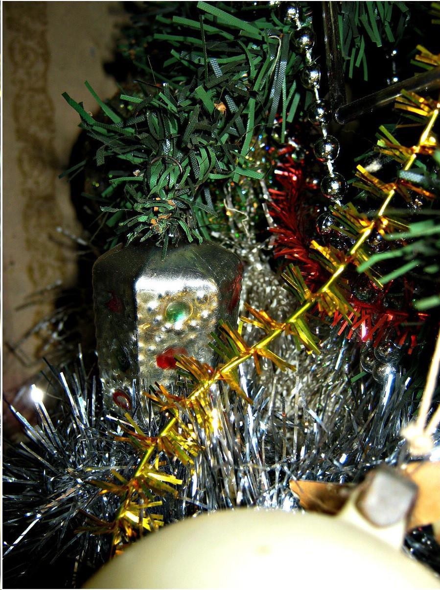 Этот старенький шарик принадлежал моей маме. Во всяком случае, сколько себя помню, он был. Полагаю, появился в наборе наших игрушек еще до моего рождения. А этого красавца на прищепке нам подарила бабушка, кажется, в конце 70-х. Таких игрушек у нас несколько, но у остальных прищепки либо сломались, либо потерялись((( Поэтому юноша с некоторых пор скучает на ветке в одиночестве.