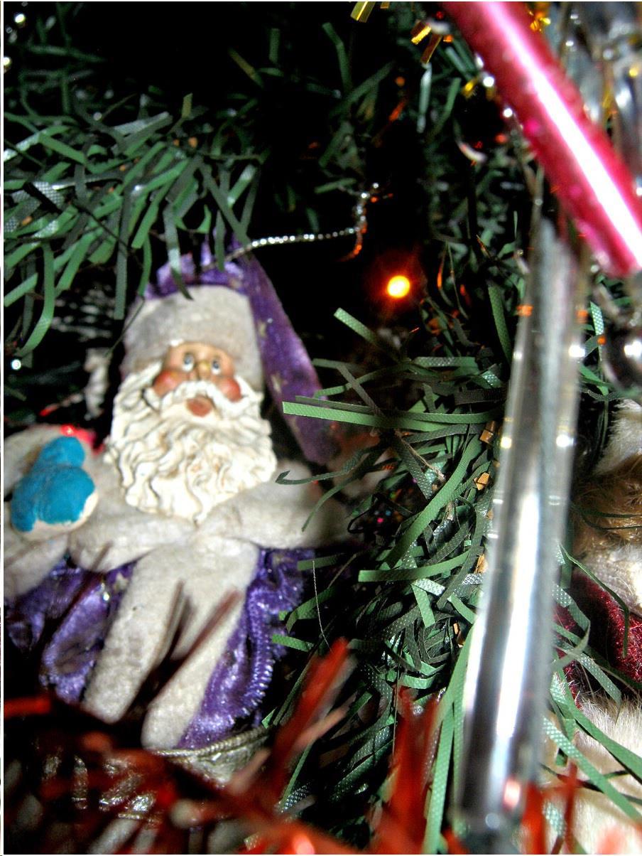 Видите там, в уголке, блестящий зеленый шар? Его я сделала сама! Когда занималась росписью елочных игрушек. Отдельная, кстати, история, грустная и смешная одновременно, оставившая в памяти глубокий след и запечатлённая в строках одной из моих песен))) Это, наверное, конец 2000-го или 2001 год. Тогда же появились у нас наши Дед Мороз и Снегурочка. Их принесли из школы мои старшие дети: Деда Мороза - сын, а Снегурку - дочка. Они прилагались к подаркам, которые каждый год дарят ученикам нашей школы московские спонсоры. Спасибо им огромное! Долгая и добрая память!!!
