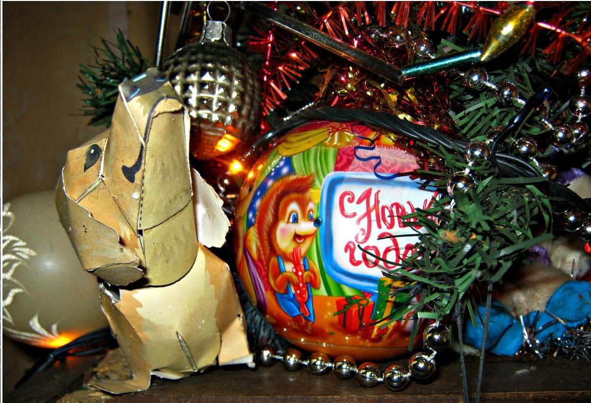 А этот большой шар с ёжиком и белочкой (которую не видно из-за ветки) принесла младшенькая из детского сада - он был частью подарка. Как и бумажная собачка-конструктор, который кроха сама выстригла и склеила (это примерно 2013 год). Одной из ее любимых игрушек является этот зимний терем. И неспроста! Он был призом, врученным ей уже в школе за хорошую учебу и активность. Подарок символический, но памятный. Достойный стать еще одной строкой в истории семьи.