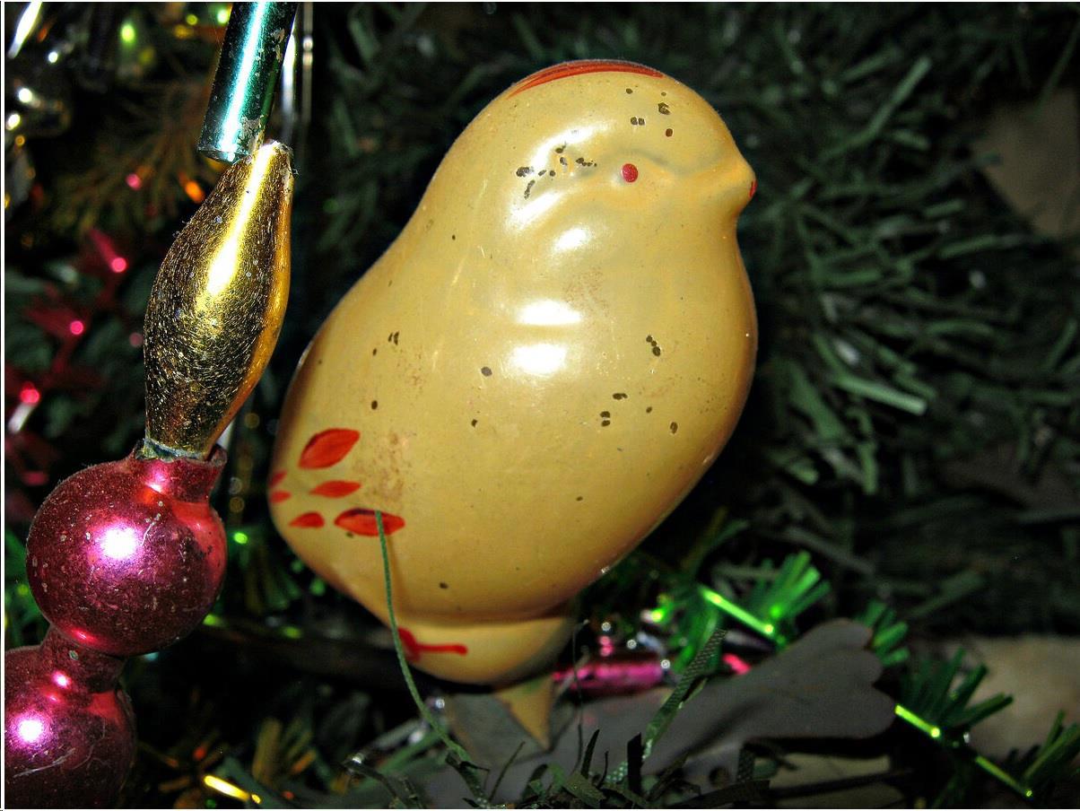 Этого милого цыпленка я помню лет с двух. Но он явно старше меня. Я люблю его и очень берегу. В детстве мне казалось, что он такой маленький, беспомощный. И чтобы его никто не обидел, я просила маму посадить его поближе к стволу, спрятать в густой хвое. А потом, когда мне стали разрешать наряжать ёлку самостоятельно, продолжила эту традицию. Её поддерживала и моя старшая дочь, которая, когда подросла, взяла руководство украшением ёлочки на себя. А когда младшей дочери исполнилось 12 лет, наряжать зелёную красавицу доверили ей. И цыплёнок, который ей тоже нравился, оказался на переднем плане. Менять ничего не стали, но переживала я за малыша очень! Благо, ничего плохого с ним не случилось.