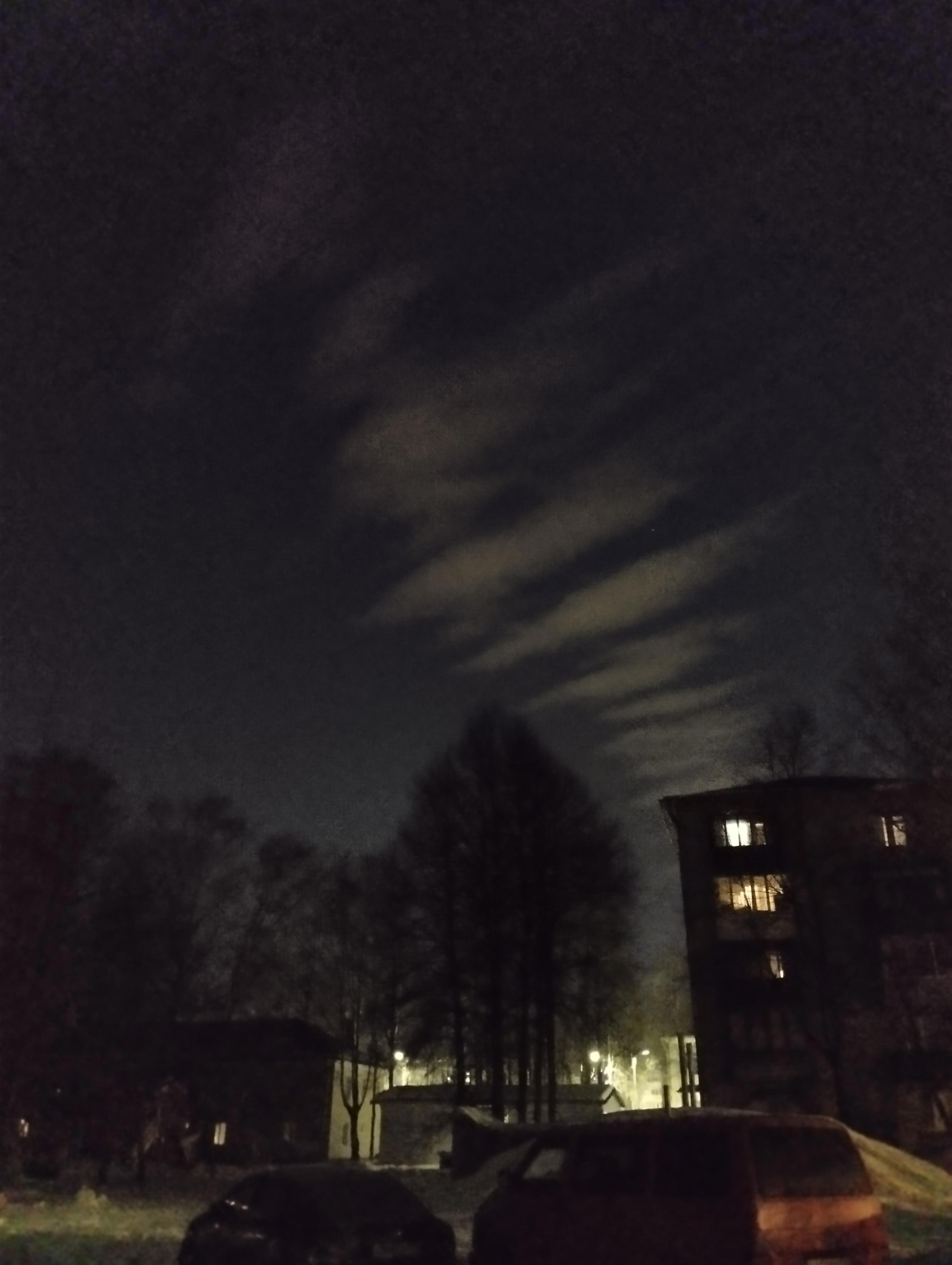 Обычно питерское небо не даёт возможности вдоволь полюбоваться всполохами даже посреди зимы. Но в этот вечер небо расчистилось. И лишь два огромных скопления лёгких облачков в виде двух гигантских перьев пересекались в зените. Вот так и получилось "небо в клеточку".