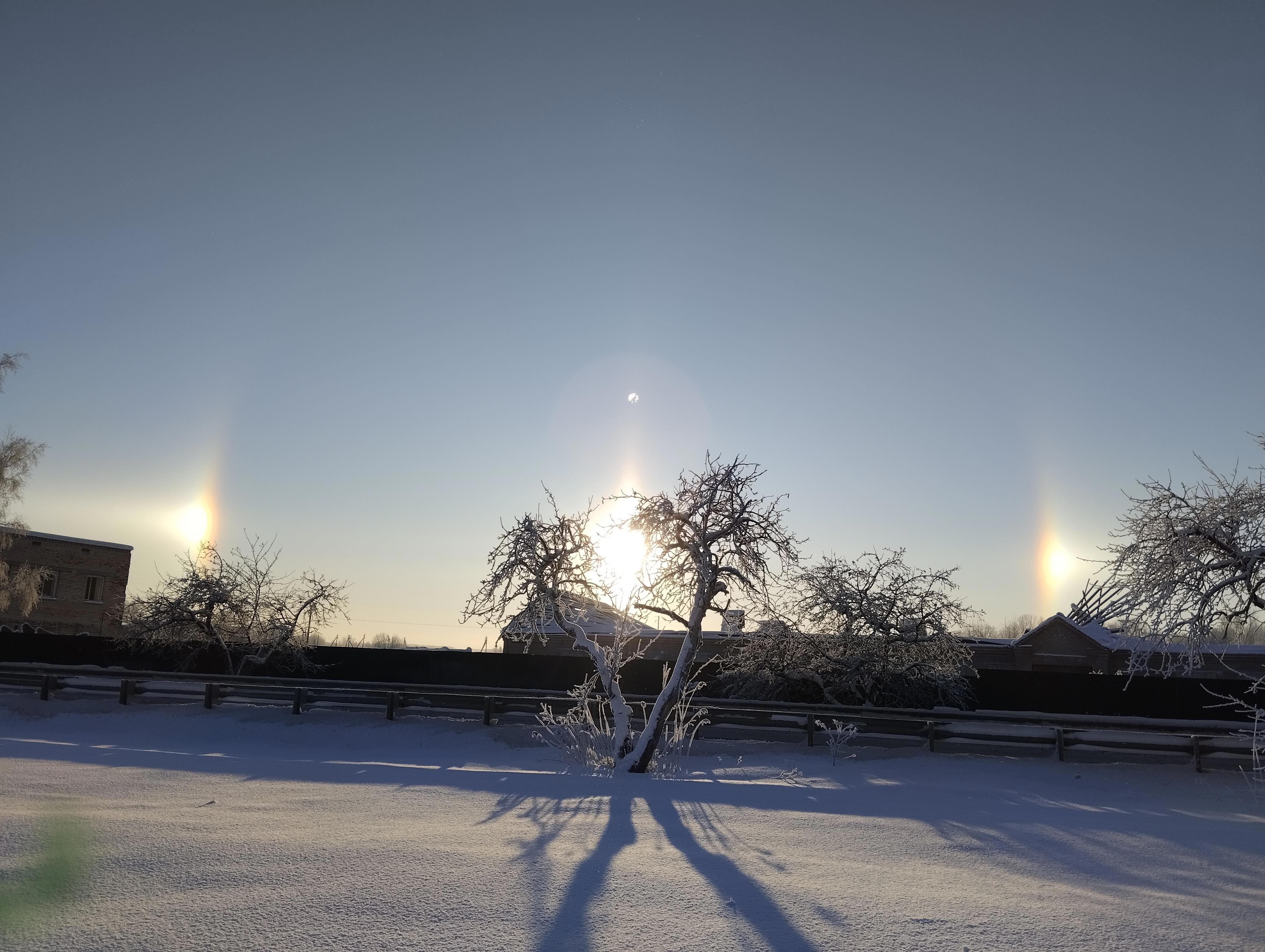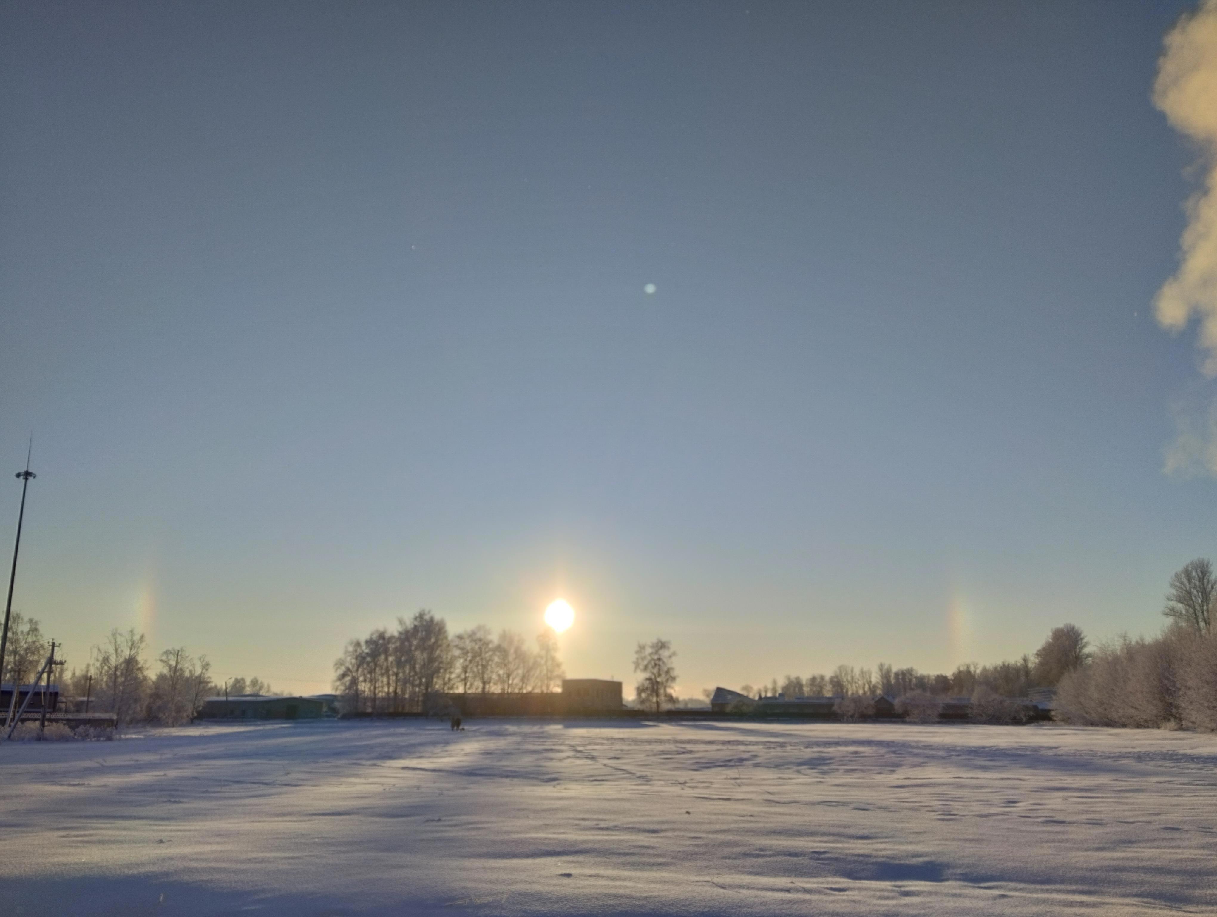 Необычное оптическое явление вокруг солнца наблюдали во многих районах Питера и Ленобласти. Во время сильных морозов это не редкость. А у нас первая январская неделя выдалась на редкость суровая для Питера - от 22 до 31 градуса холода. В центральных районах, конечно, потеплее, а вот на окраинах и на пустырях, где собачники выгуливают бедных питомцев, холод был поистине собачий.