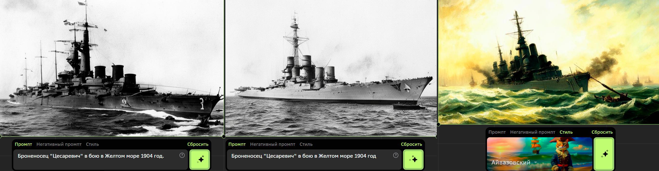 В первый раз серьезно столкнувшись с нейросетями, я, тем не менее быстро понял, что по моему запросу никакой ИИ не собирается отправляться в Гугль чтобы узнать кто такой Витгефт, как выглядел броненосец "Цесаревич" и вообще. Вот Вам броненосцы, которые я уговорил отрендерить нейросеть: