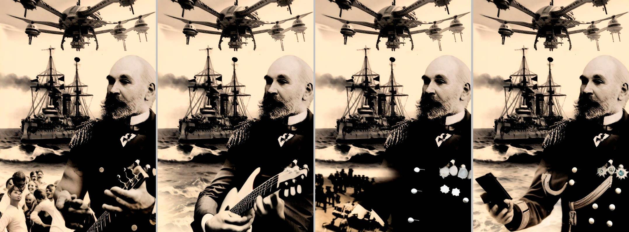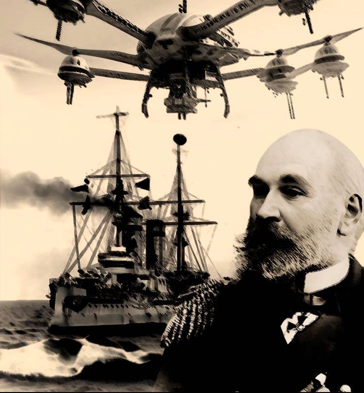 За основу был взят главный герой - контр-адмирал флота ЕИВ Вильгельм Карлович Витгефт. Задумка для обложки типичная. Потрег ГГ, на заднем фоне - что-то батальное (меня интересовало море и броненосец, на котором принял последний бой адмирал), в небе над этим всем - дрон в стиле стимпанк (главному герою придется представлять, как выглядит дрон из будущего).