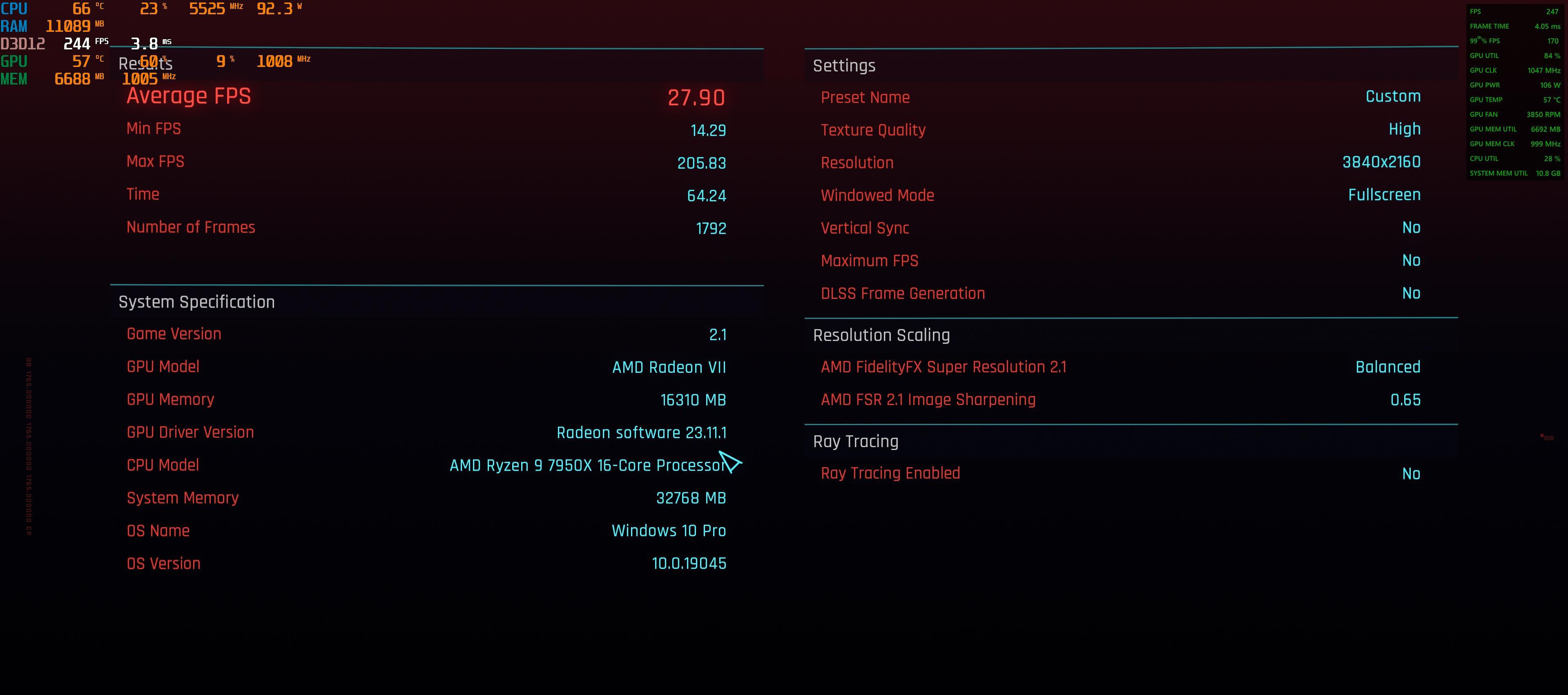 На определённом этапе было замечено, что по непонятным причинам первый прогон внутреннего теста Киберпанк 2077 версии 2.1 выдаёт завышенный максимальный фпс сильно больше 100(а порой и выше 200) с одновременной сильной просадкой по-минимальному фпс(ниже 10), после повторного прогона минимальный фпс вырастал, максимальный снижался так что более адекватным для 4к являются всё же 60-70фпс в данной конфигурации пк и настройках, а не 205 иже сними(для максимального качества в настройках), при установке ряда ползунков на шаг ниже можно получить максимальный фпс более 100, что можно увидеть на двух последних скриншотах из киберпанка.