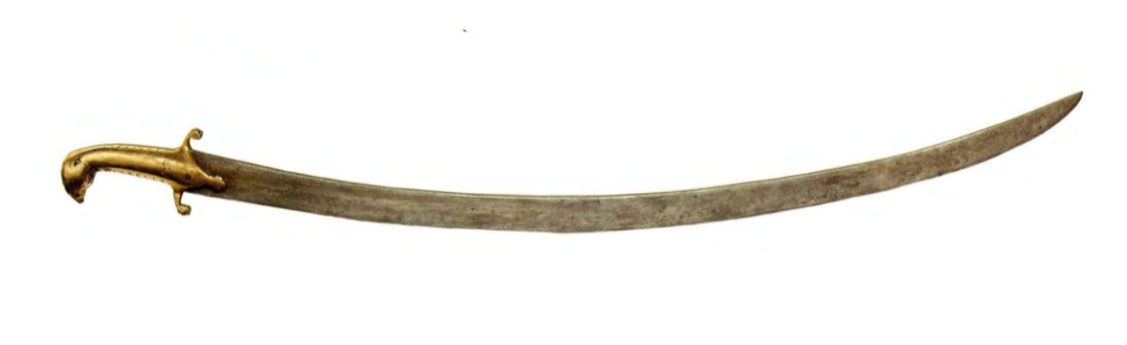 То есть в целом оружие выглядит эдакой сборной солянкой – крестовина с лангетами, характерная для восточного оружия и, впоследствии перенятая саблями польско-венгерской традиции (и не только), слабо выраженный загиб рукояти (если есть) – это характерно для ранних сабель. Клинок с долом в сильной части – этого сколько угодно у клычей. Но нет елмани, а клинок сужается, как у шамшеров. При этом острие отломано или срезано (????)