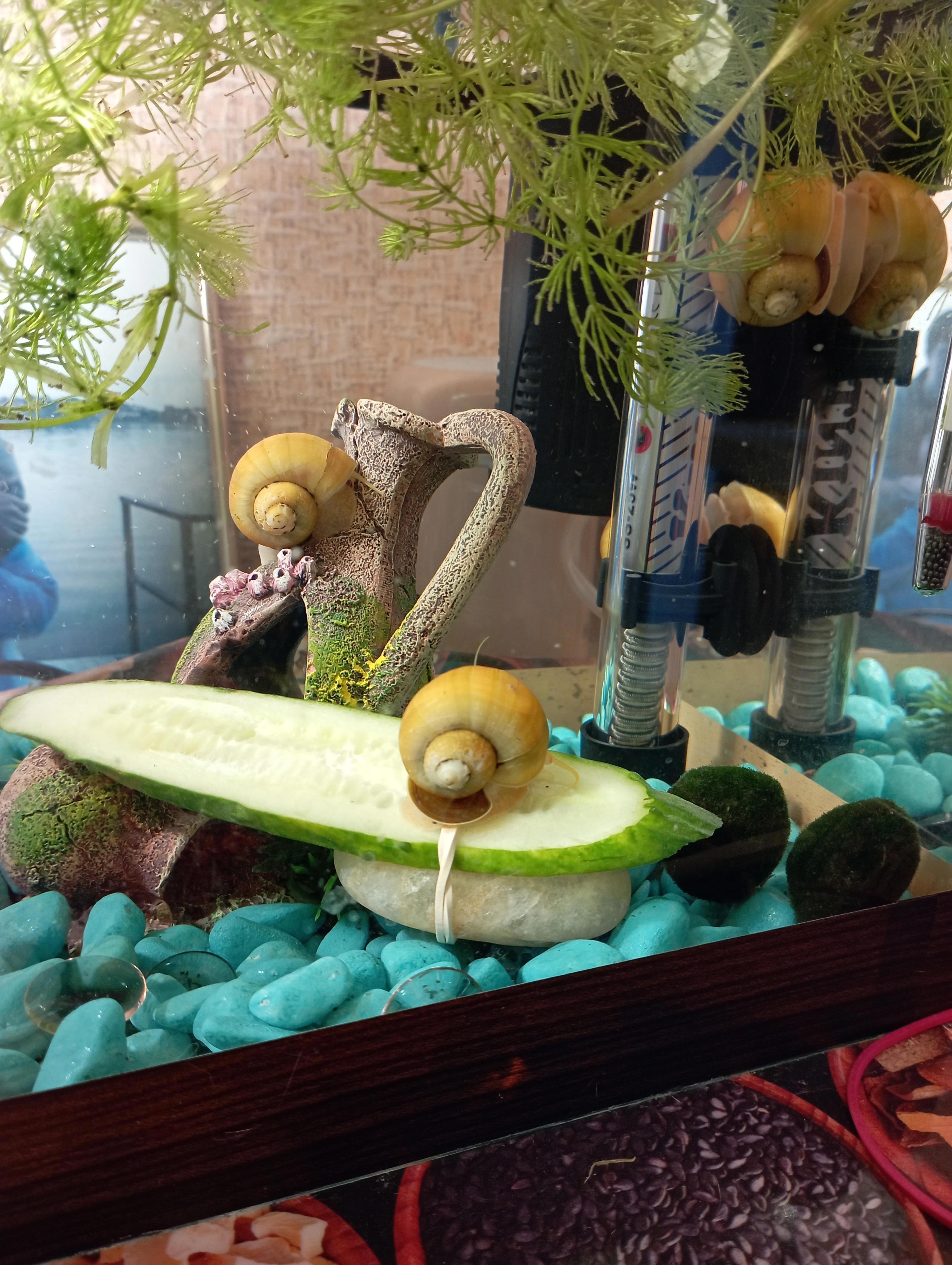 Поскольку улиток я не различаю, не могу точно сказать, кто из них отважная десантница. Поэтому всех вознаградила кусочком сочного огурца. Пусть радуются.
