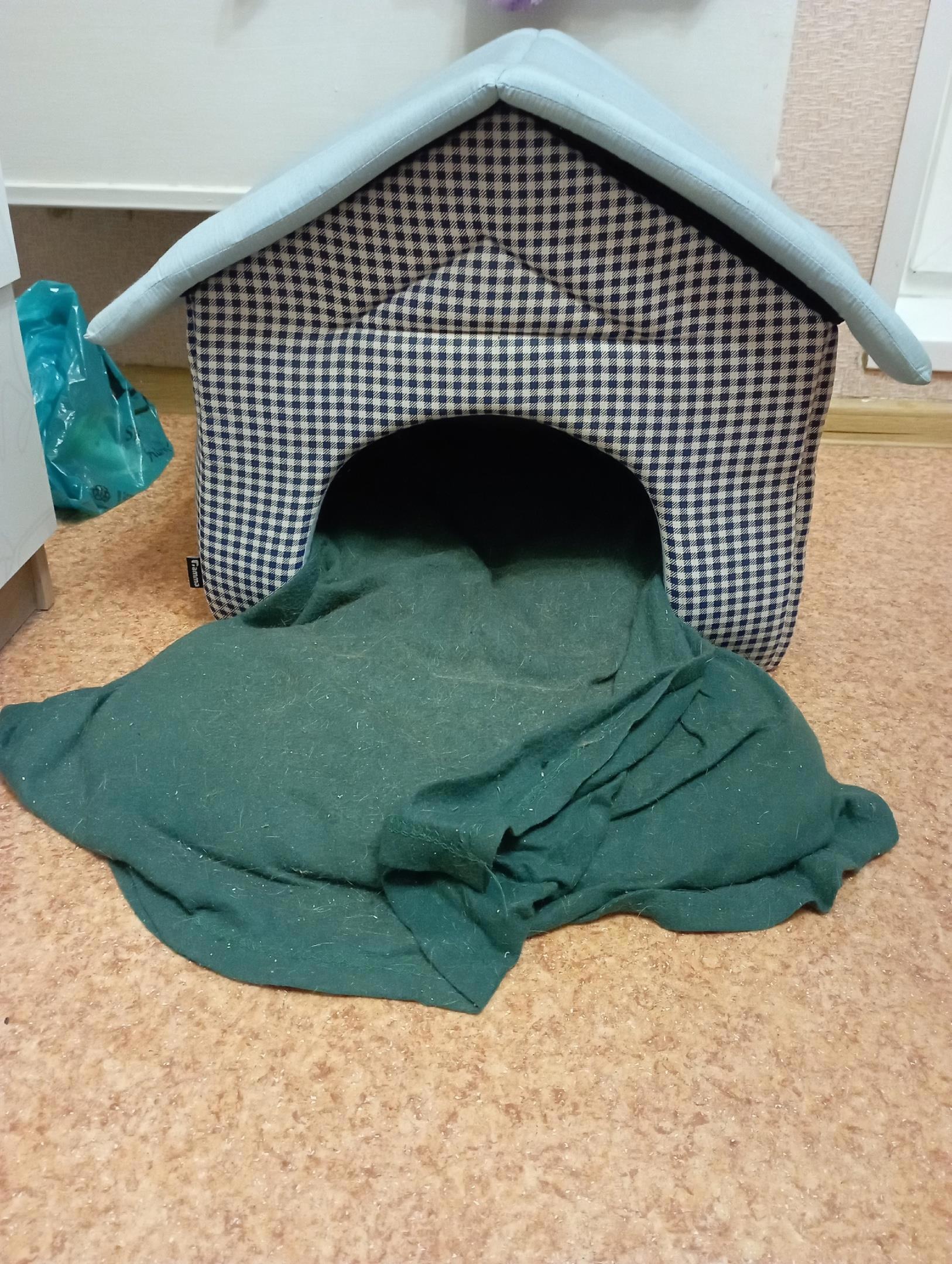 Включили полностью свет, стали проводить расследование. Ход восстановленных событий таков: в районе полуночи улитка выбралась из аквариума (мы засыпали и сквозь сон слышали какой-то звук, но проверять не стали) и какое-то время путешествовала по комоду, на котором аквариум стоит. Потом отважно десантировалась вниз. А это, на минуточку, метр двадцать или больше! Но, на счастье улитки, внизу стоит мягкий кошачий домик. Вот такой.