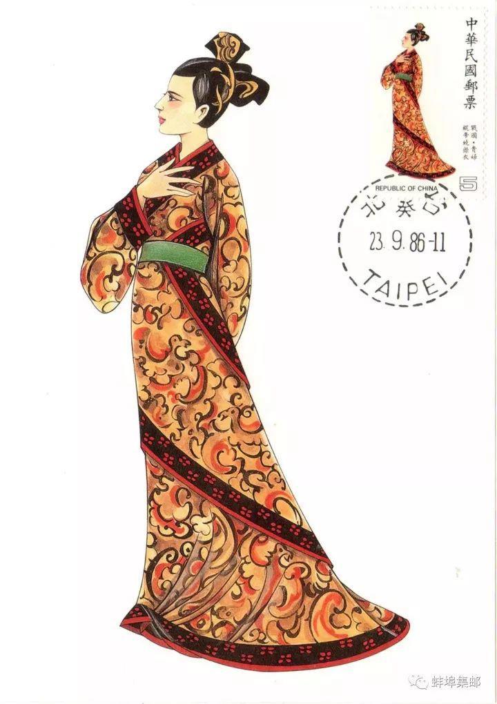 ➋. Период Воюющих Царств (6-3 в. до н.э.): Знатная леди в одежде с оборачивающейся вокруг тела полой (绕襟衣) с расшитым поясом (绲带)