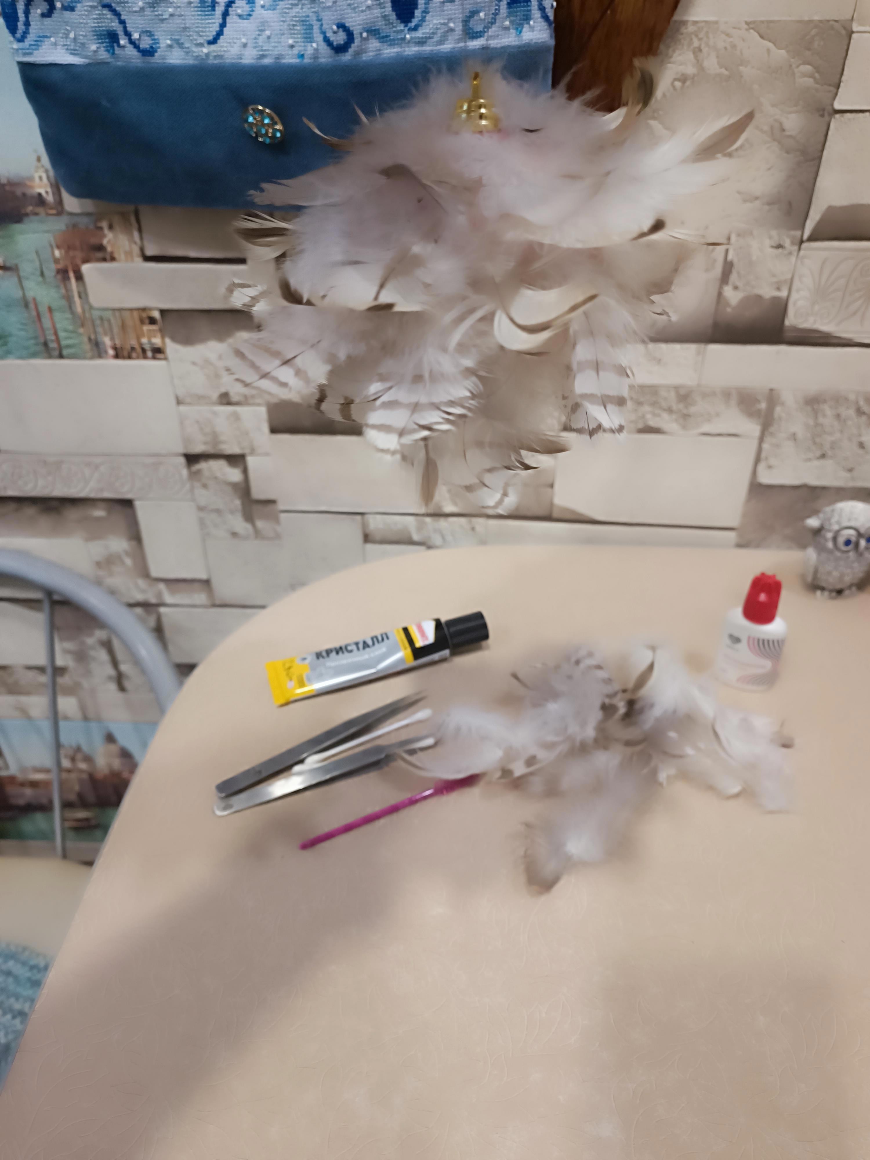 Собственно - рабочее место и инструменты. Пёрышки, пинцеты, расчёска-щёточка, обезжириватель, клей, основа - пластиковый шарик. Сам шарик со всяких ракурсов: